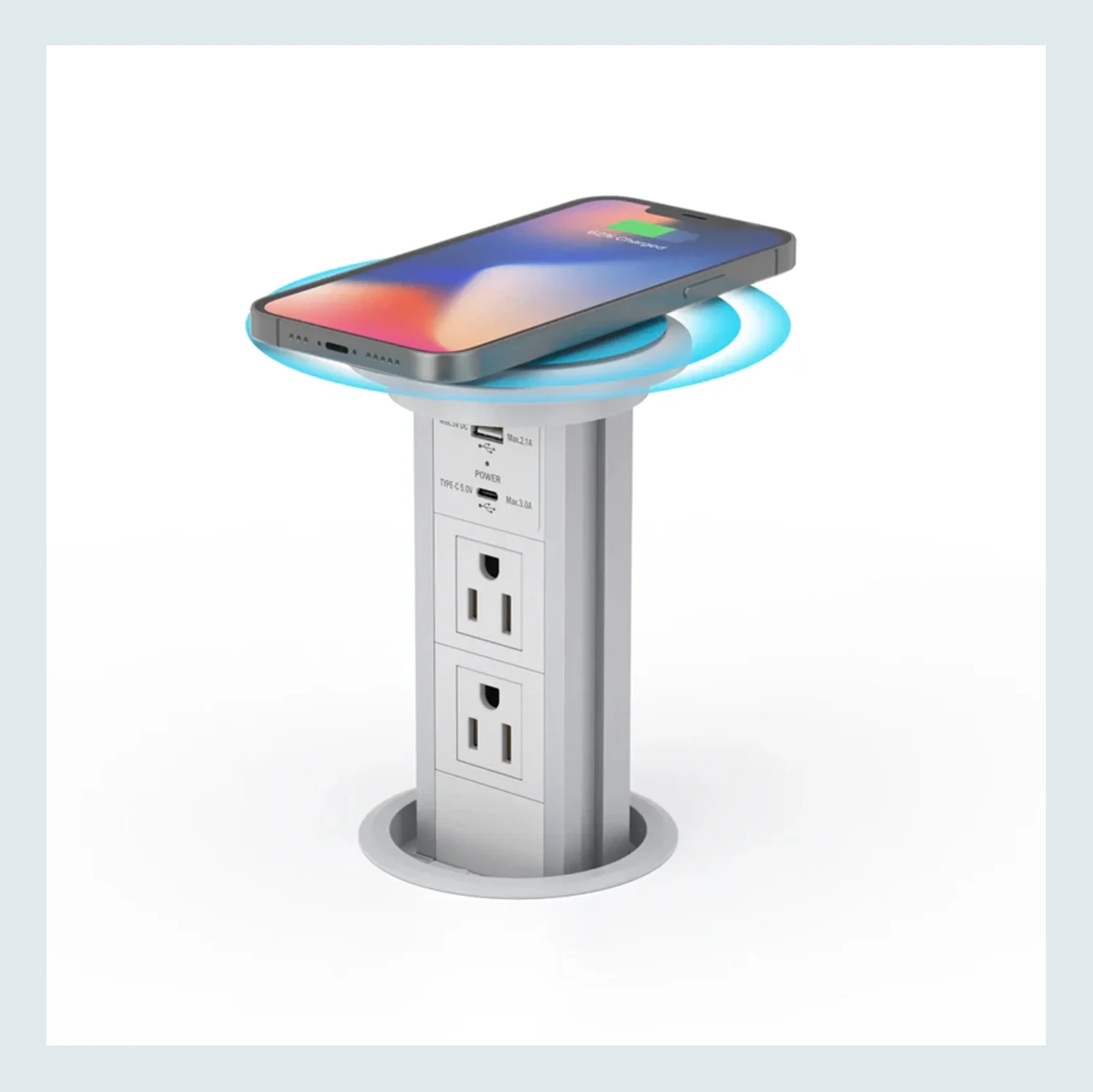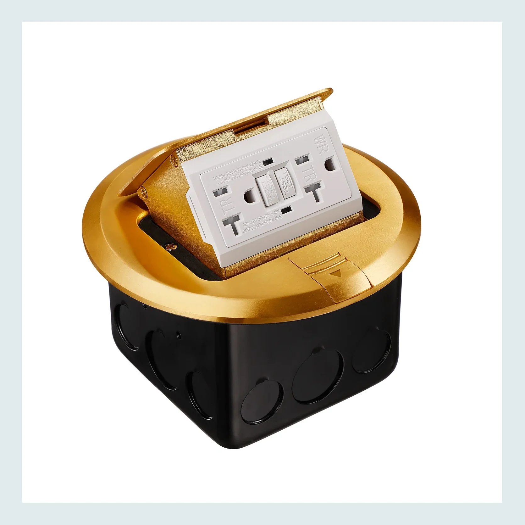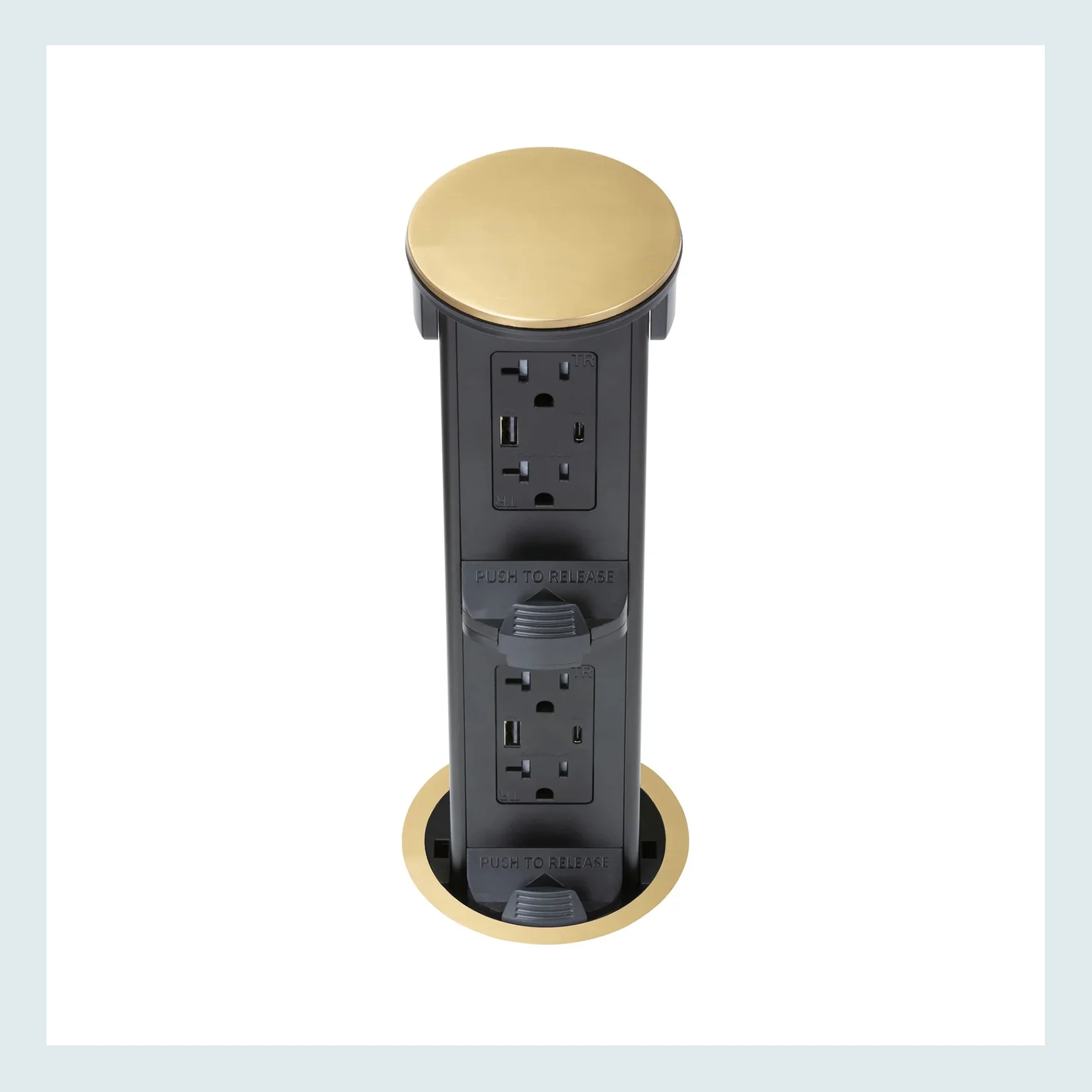 White Motorized Pop Up Outlet with USB | Brass Round Kitchen Pop Up GFCI Outlet