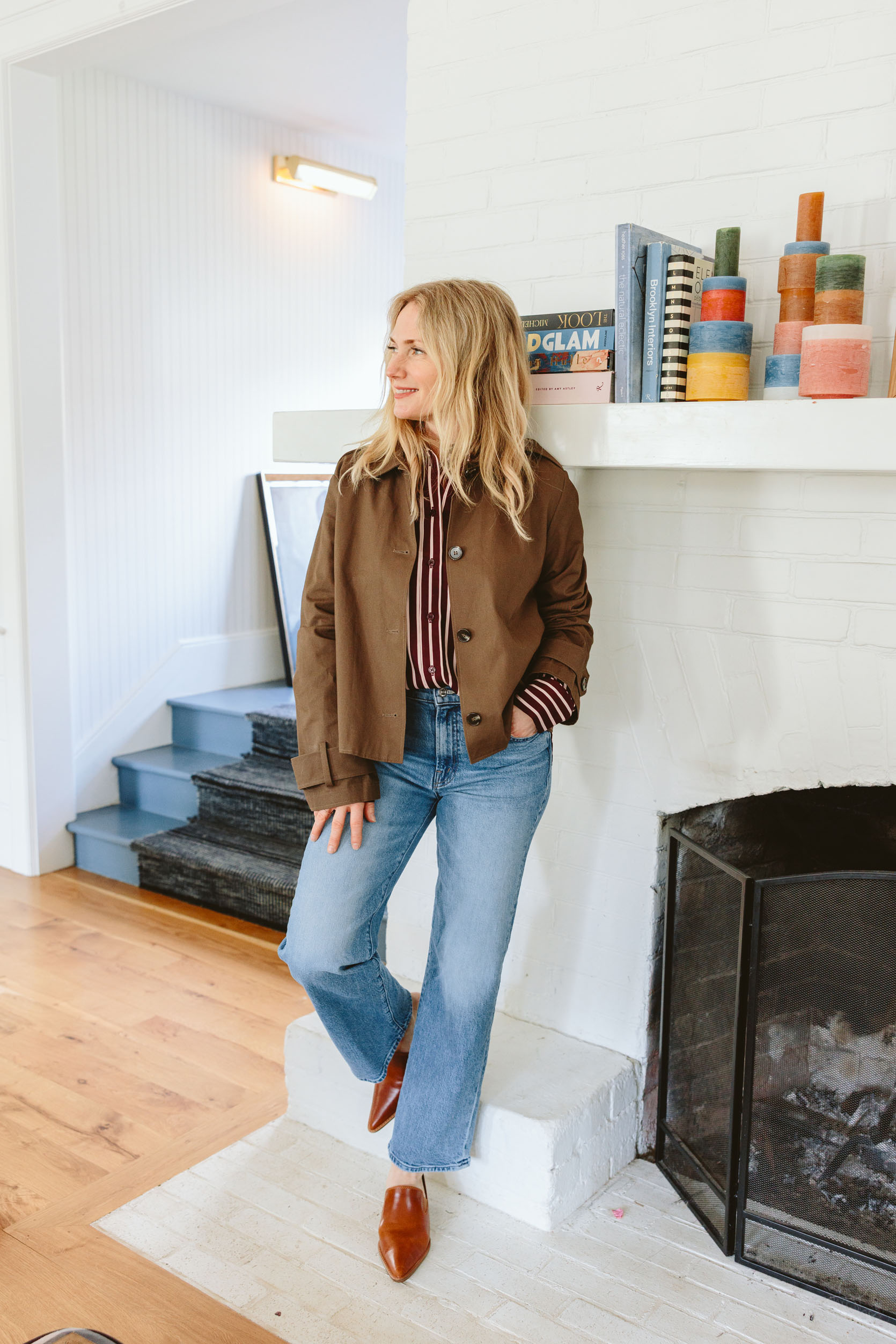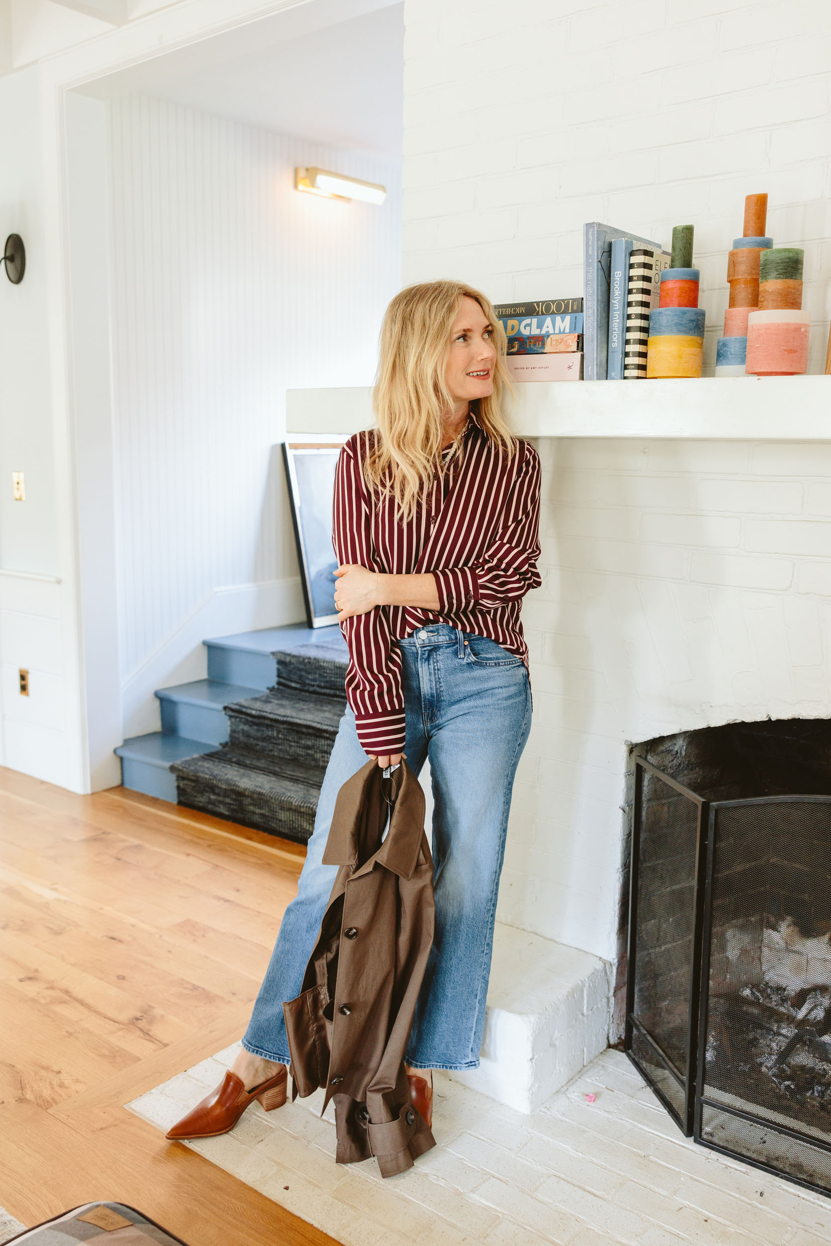 These are those awesome Mother jeans that I can’t stop talking about or wearing, paired with a silky blouse in a great colored stripe (burgundy and rose) and a really affordable brown 1/2 trench.