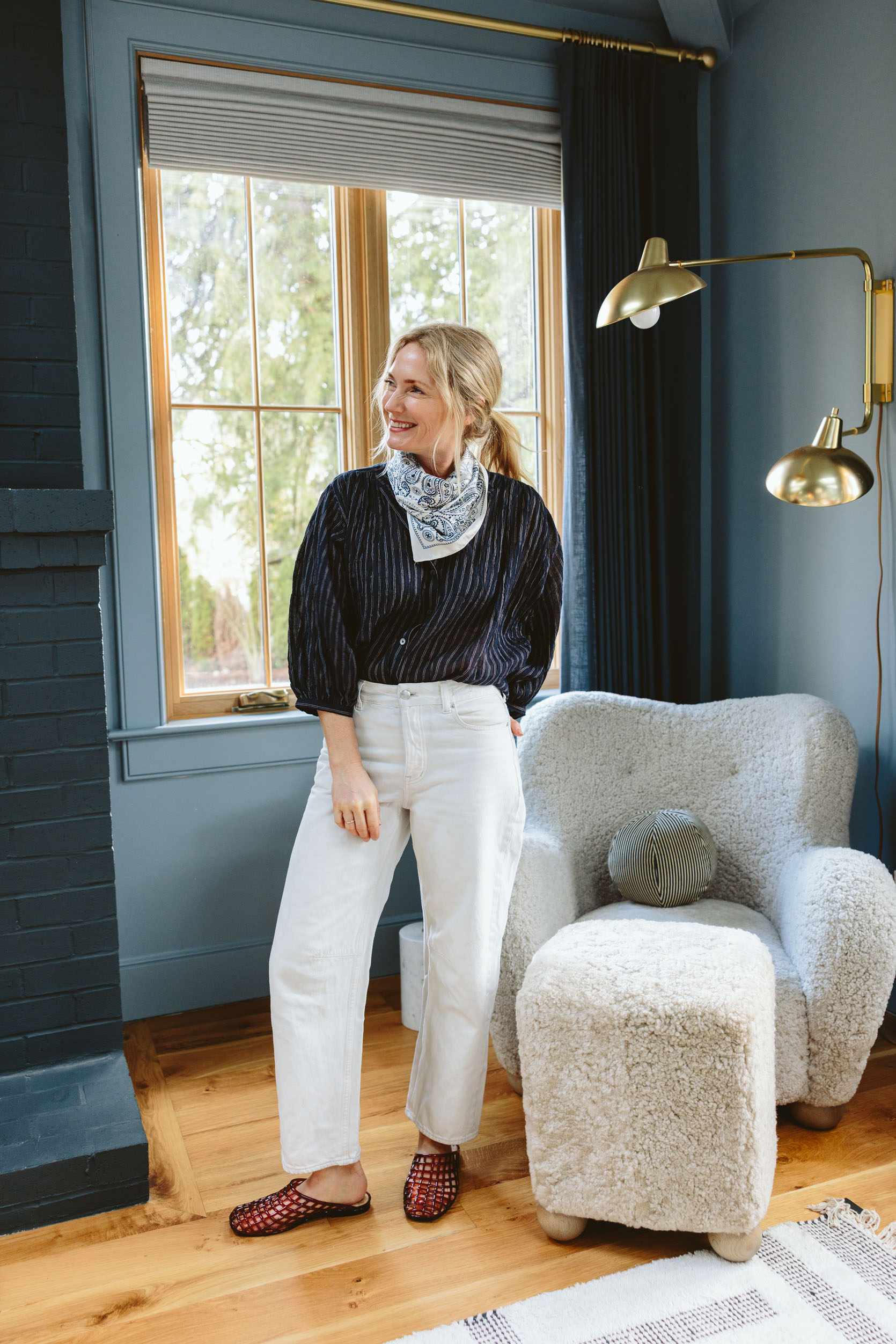 I’m excited to pull out these cream barrels. I sized down in these and always feel good in them. The top is the same as my balloon blouse I bought in the fall, but in a dark navy and cream stripe (and a stiffer material). I love how those jellies can just look like shoes, not beach sandals.