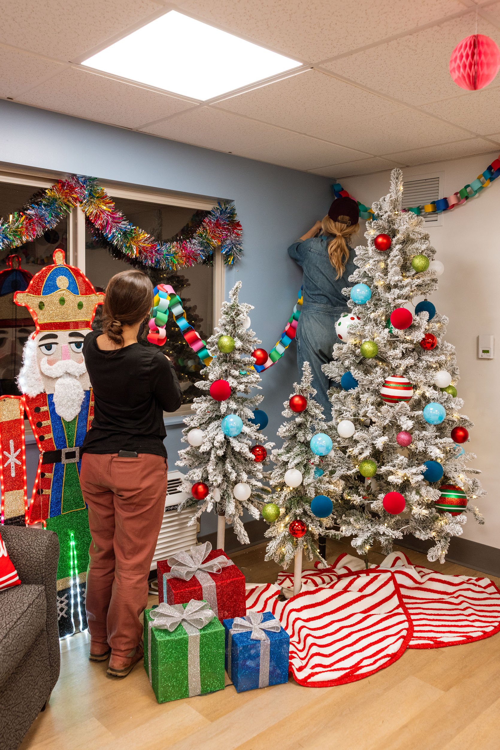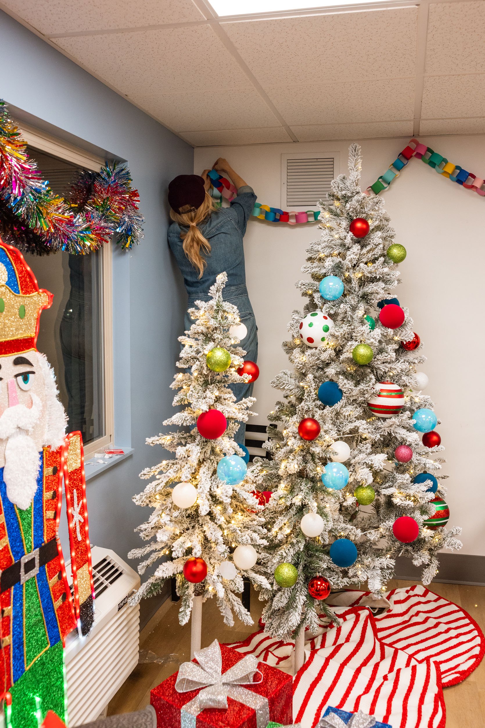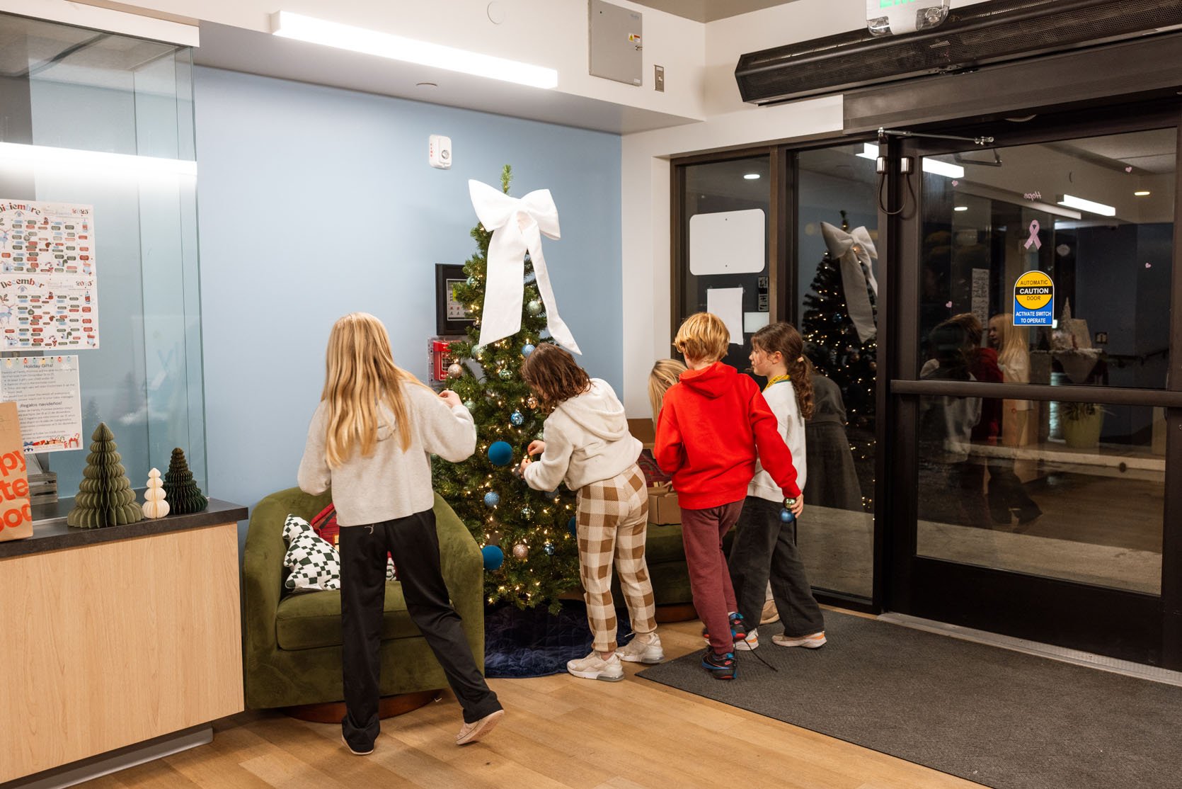 Alright, y’all. Today is a quick post that might spread a little bit of holiday cheer, I know it does for me. I got pretty emotional writing this, not because of how beautiful it turned out (it’s cute though:)) But thinking about the moms living here during the holidays and what that must be like for them. It’s an immediate shutdown of all my overwhelm and puts things into place pretty quickly. This is our third year of decorating the Family Promise Shelter for the holidays with my kids (and this year, like 12 of their friends:)). The building is a former La Quinta hotel that has been turned into a shelter that houses and rehabilitates 70 families (each family has their own room or adjoining room, depending on size). The angels that work there help them to find permanent housing and jobs, and we witnessed so many kind and tender moments between the families and the employees while we were there (if you are a social worker, god bless you, seriously). It was recently renovated, and we helped furnish the lobby last year and have some ongoing projects in other spaces, but adding the holiday layer was so fun, fast, and fulfilling (and something my kids can be involved in). It’s honestly a huge gift to me to be able to do it, and it has become an afternoon that I really, really look forward to during the busiest time of the year. It’s a huge reset and reframe that I personally need to get me out of the stuff that doesn’t matter and back down to what does, so thank you. I’m so grateful to Family Promise for letting me bring this very respectful and excited crew in for a few hours last week after school. More at the end of the post on how you can help, should you be able to.