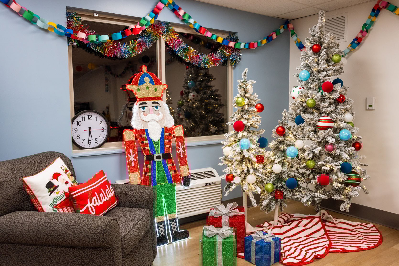 We did three different color palettes per room – more of a traditional red/green/white in the dining room, an icy winter wonderland in the lobby, and more of a Dr. Seuss colorful vibe in the bonus room.