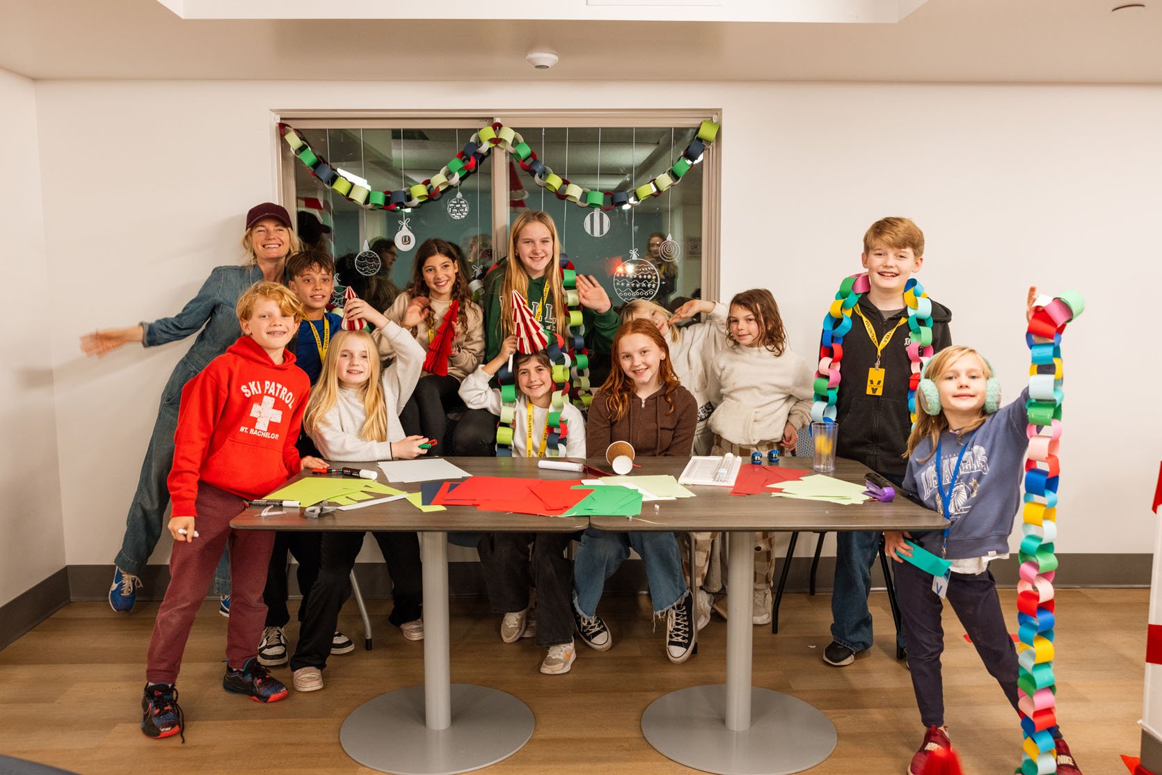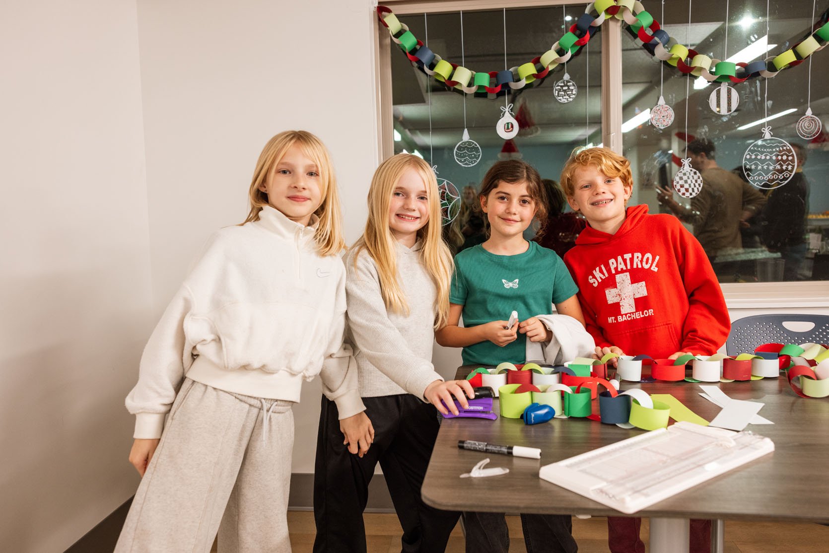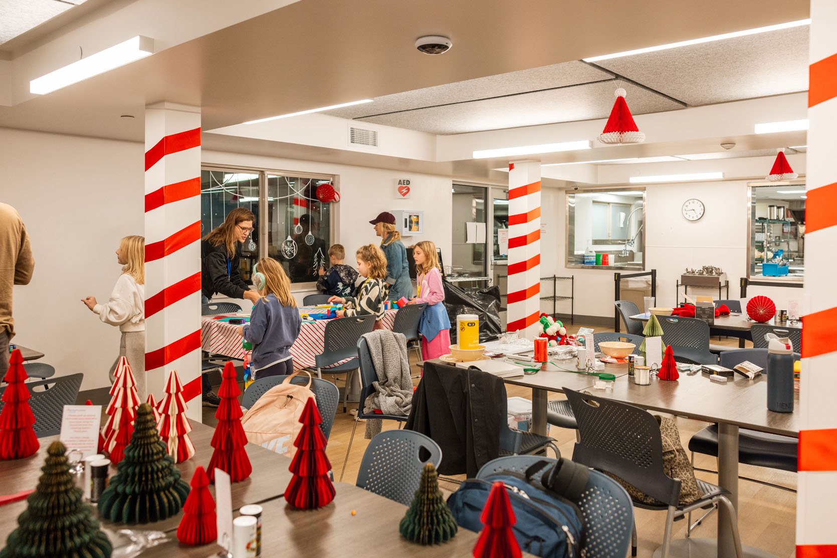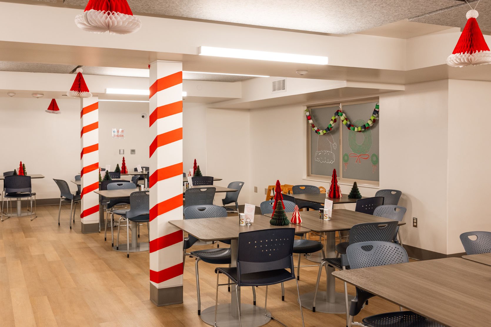 Kaitlin came with her girls to help, too, and she snapped a few very quick photos to show you. It was 6 pm, no light and no time to style-to-camera, but you get the vibe 🙂 We put clusters of foldable paper trees on each table and drew on all the windows. We used Posca paint markers and these fat ones (the internet told me they’ll easily wash off). Then Brian hung these Santa hats from the corners of the ceiling tiles. It felt festive and high-impact considering all the constraints.