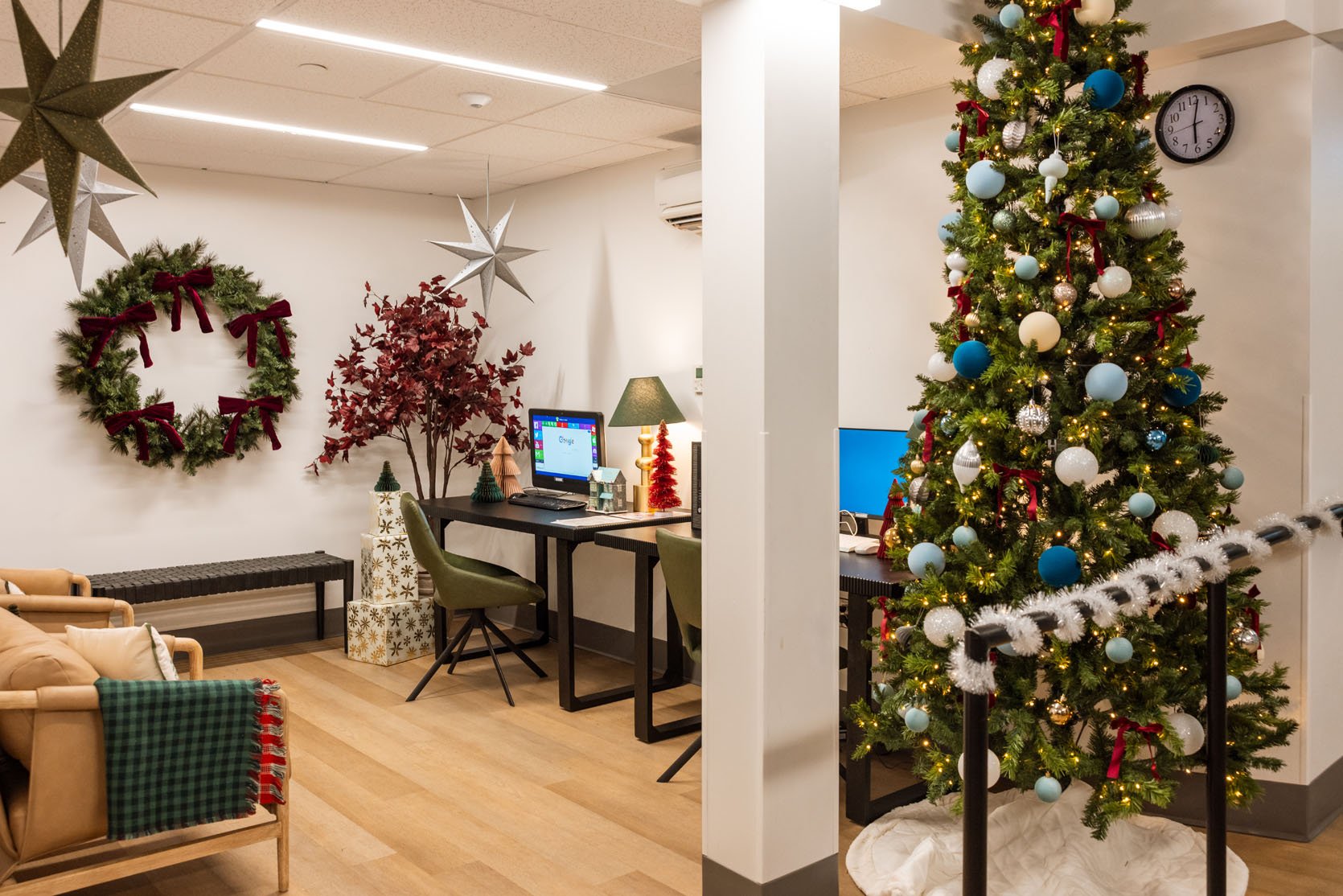 We added that potted tree in the corner (from Target) and two lamps to the computer tables (that will stay permanently), along with some holiday village houses, holiday pillows, and a throw. Then Gretch figured out how to hang these stars with paper clips from the ceiling tiles. The tree we bought last year fit perfectly in this little nook, and we used mostly blue, silver, and hits of burgundy (the bows) on it.