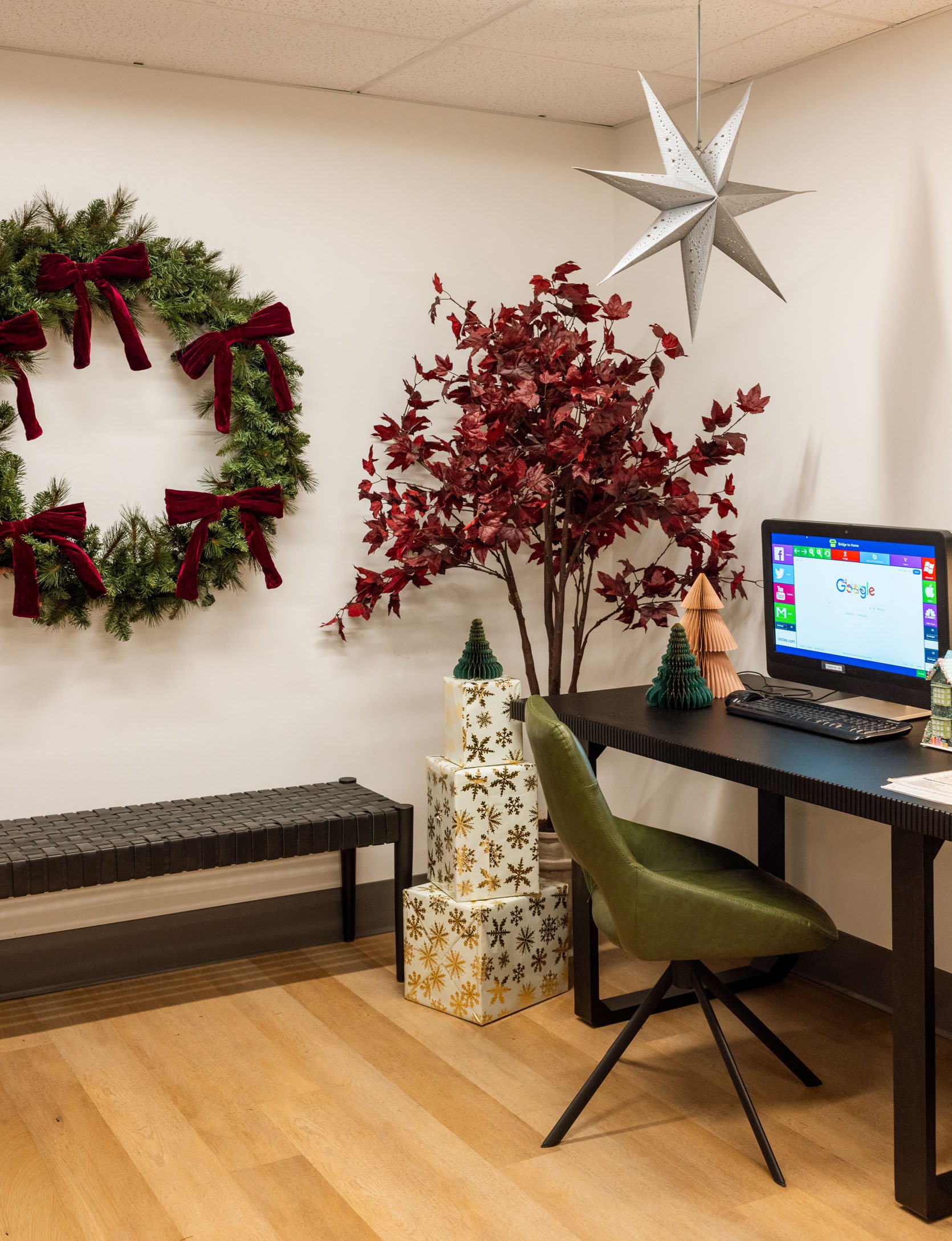 While we didn’t furnish this room, it’s so nice that all the pieces match (they didn’t last year). It was tricky to figure out how to decorate all the rooms without putting anything on the walls (except one nail for a wreath that they approved). Having been newly renovated, the operations manager didn’t want even command strips or blue tape on the walls, so we needed to get creative on the window and columns. (Most people don’t know how to take off command strips properly, so we fully understood the fear of damaging the new walls… I mean, I begged and promised at first, but ultimately our job was to make their lives easier, not harder, so we came up with some creative solutions.)