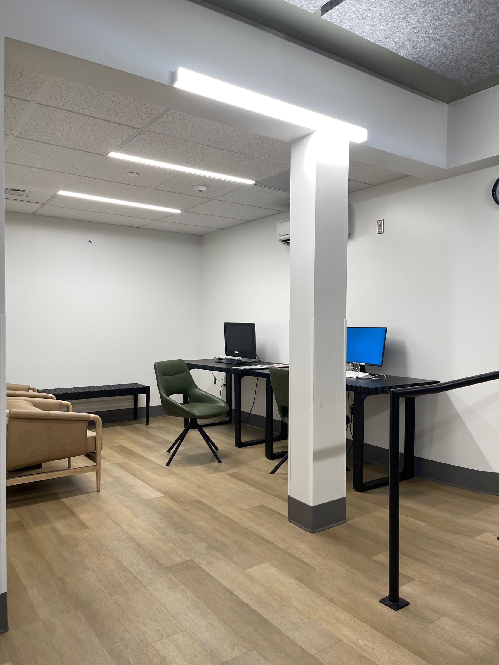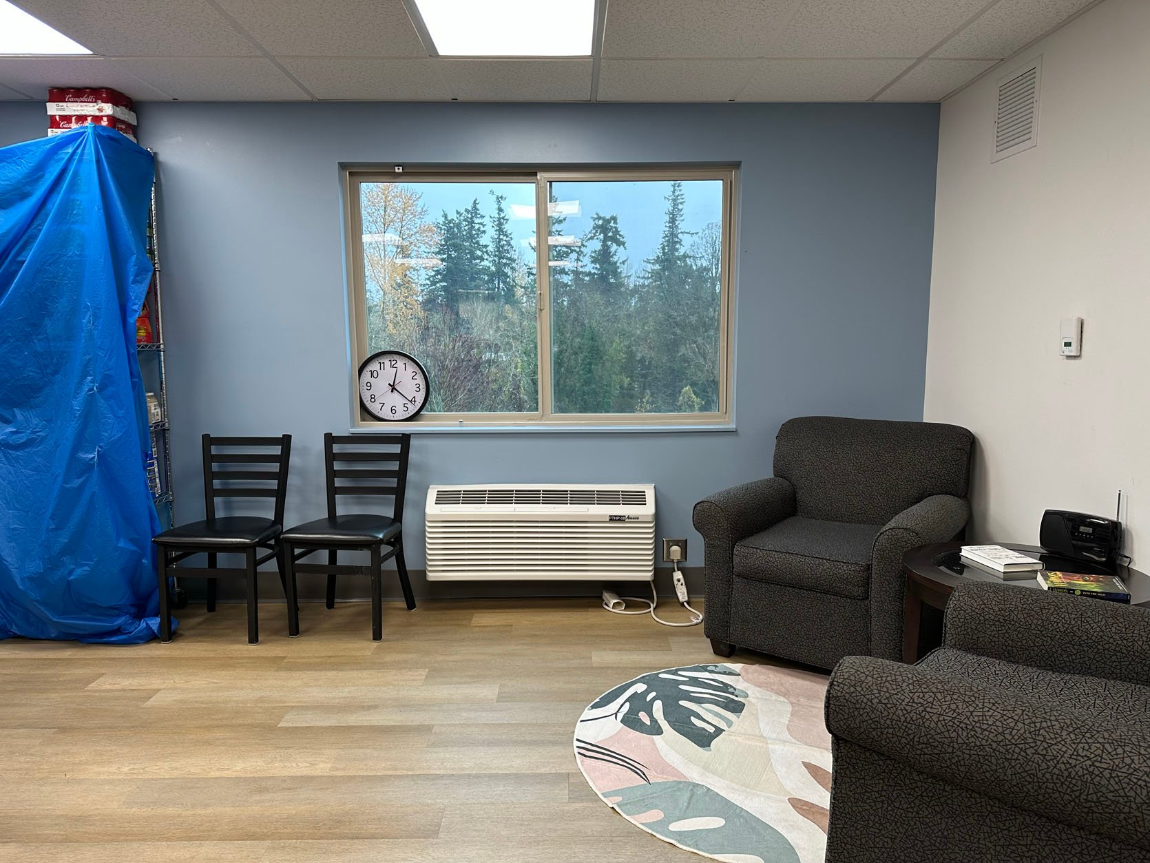 The lobby is newly updated and was a blank slate for us. A huge shout out to AllModern for gifting the furniture a couple of months ago. Gretch helped pull this together, and it’s obviously not accessorized yet, but having nice-looking furniture versus random pieces that are donated makes a huge difference. We chose high-quality, easy-to-care-for pieces that look good together. The employees were so, so grateful.