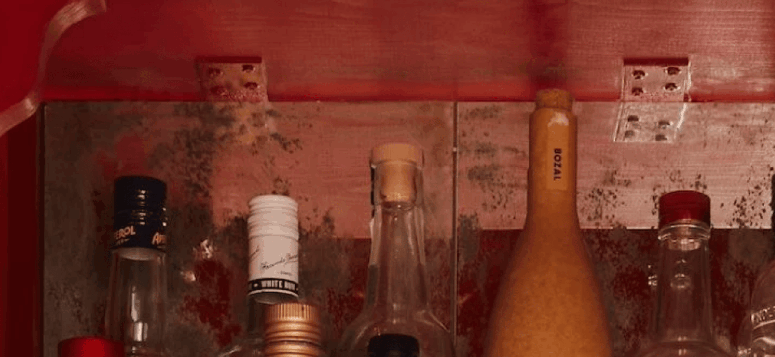 Person for scale! Hi! My main inspiration was the wine bar at the Parker Palm Springs – if you haven’t been, it’s iconic (also, I’m clearly very obsessed with The Parker as it was also a major source of inspiration for my 500 sqft studio apartment). It’s an ultra sexy, low-ceilinged wine bar that fits about 20 people, maybe 30 max. I love the intimacy and knew I could create something similar in this very intimate closet bar, which seats 1 or 2 max if you’re playing 7 minutes in heaven.