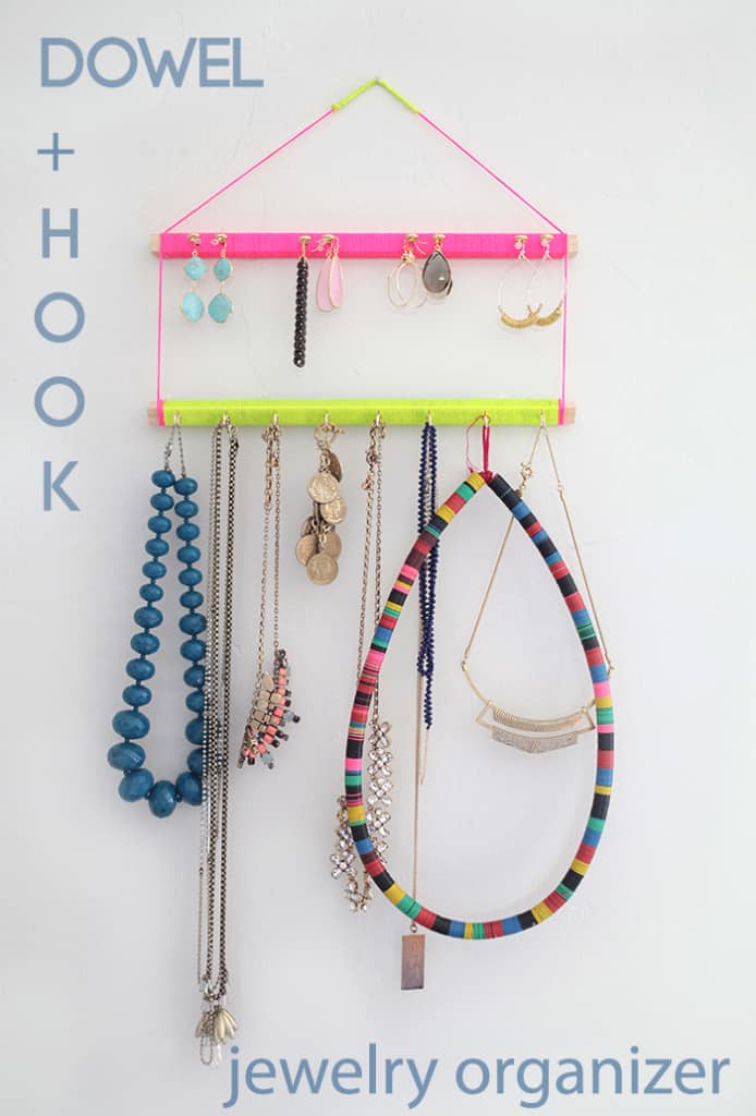 I love this DIY. Its one of those that took a bit longer than our normal simple ones, but its so satisfying to look at. And before you think, ‘wait, I don’t love pink and neon’ think, what if it was just wood and brass or black and white string? or even jute twine? so many options, so little jewelry. Lets get into it. Here’s what you’ll need: