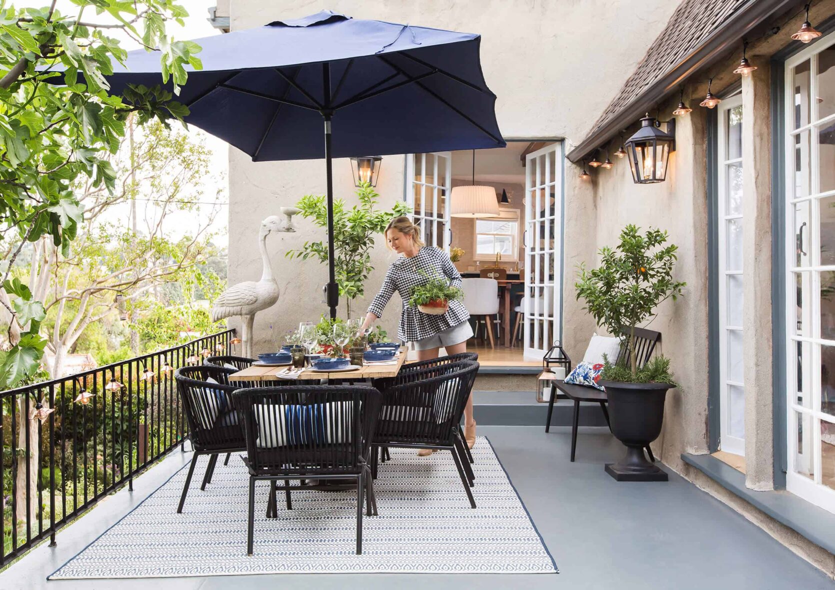 1. Melamine Navy Round Serve Platter | 2. Melamine White & Navy Round Dinner Plate | 3. Dot Medallion Melamine Bowl | 4. Cloth Napkin | 5. Rose Gold Flateware | 6. Standish Dining Chair, Set of 6 | 7. Rectangular Patio Umbrella | 8. Dining Table | 9. Copper String Lights | 10. Outdoor Rug | 11. Round Copper Tray | 12. Candle Votive | 13. Wine Glass | 14. Gray Glass Tumbler | 15. Black White Micro Stripe Pillow | 16. Black & White Tassel Lumbar Pillow | 17. Floral Lumbar Pillow | 18. Blue Stripe Lumbar Pillow | 19. Outdoor Throw Blanket | 20. House Terrarium | 21. Mini Copper Succulent | 22. Orange Ceramic Vase With Lid | 23. Black Footed Planter | 24. Terracotta Planter | 25. Windsor Metal Stack Loveseat Bench | 26. Bar Cart | 27. Copper Ice Bucket | 28. Pink Drinking Glass | 29. White and Blue Bottle Vase | 30. Tall Blue Ribbon Vase | 31. White Pelican Planter | 32. Square Black Tapered Planter | 33. Blue Ceramic Dip Bowl | 34. Marble Cheese Board | 35. Wicker Pouf | 36. Black Metal Patio Club Chair, Set of 2 | 37. Black Drum Accent Table | 38. Black Metal Patio Loveseat | 39. Copper Drum Table | 40. Copper Lantern with Square Handle | 41. Black Metal Lantern with Hood | 42. Copper Tapered Lantern | 43. Extra Large Black Lantern | 44. Copper Moscow Mule Mug | 45. White Metal Beverage Tub | 46. White Serving Bowl