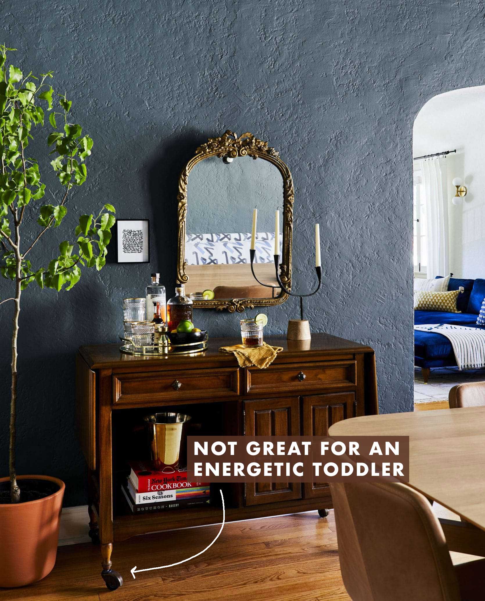 You see that little cabinet up there? With the cute casters? Those don’t lock, and on wood or tile floors, it’s so easy to move around. When your kid is young, this is a bad thing because it’s not stable as they learn to stand or walk. They can either topple over due to the furniture moving, or something on the top of it could fall over onto them, too. When they’re older, they’ll have different motivations. I still have this cabinet and thankfully, my kid has no interest in it, but that may not be the same truth for another kid that comes along or in a different family. Your best bet is sturdy, immovable furniture.