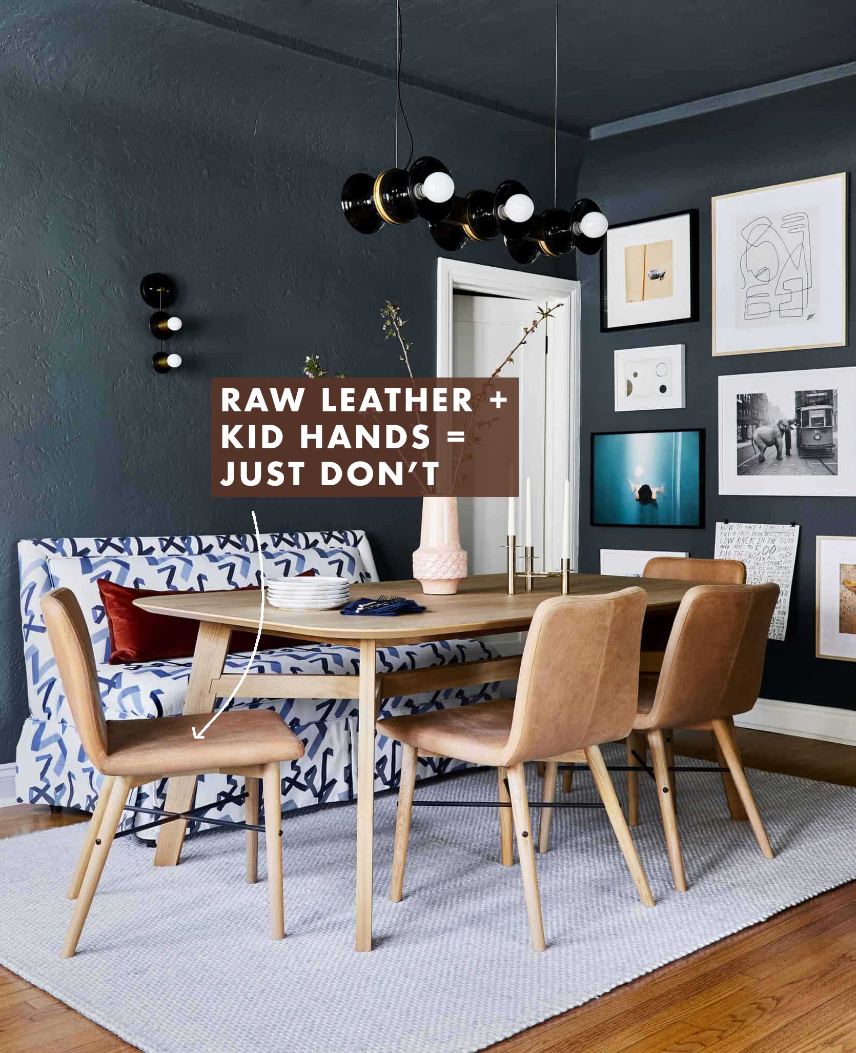 There’s a theme here with the versatility of wood in a home with children. If you’re concerned with comfort, you can always add a removable seat pad that can be cleaned or swapped if worse comes to worst. Oh, and like in the sofa world, there’s also performance fabric. The offering is less wide in dining chairs than for couches, but you can find them. Or you can source your own Sunbrella or Crypton fabric, for instance, and get your chairs reupholstered.