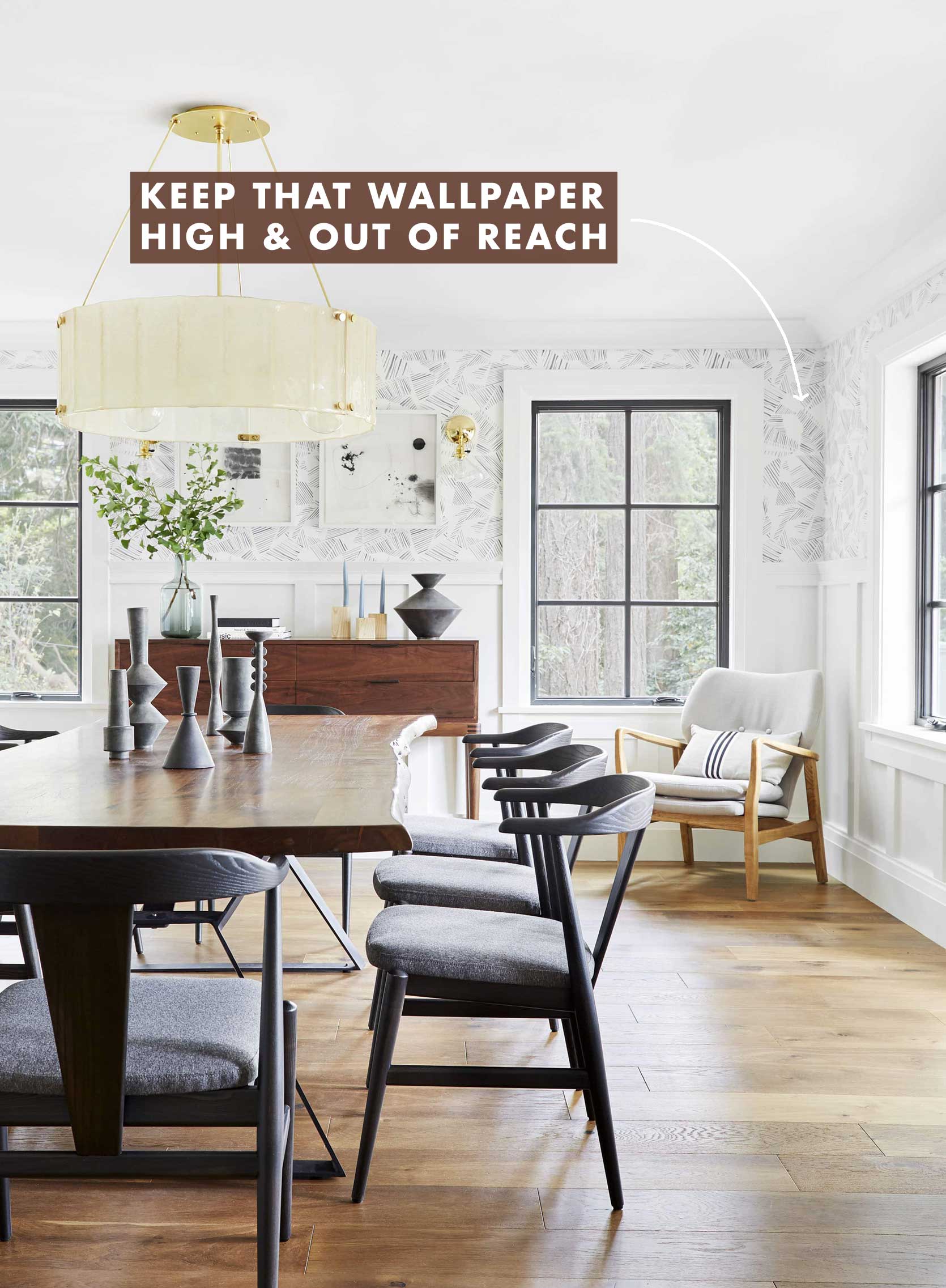 My advice to anyone who wants the color and pattern of wallpaper but is stressed about a kid ruining it is to keep it on the top 1/3 of the wall, above trimwork or a chair rail. That way, it’s far more out of reach from all the action but still checks the boxes of your design needs.