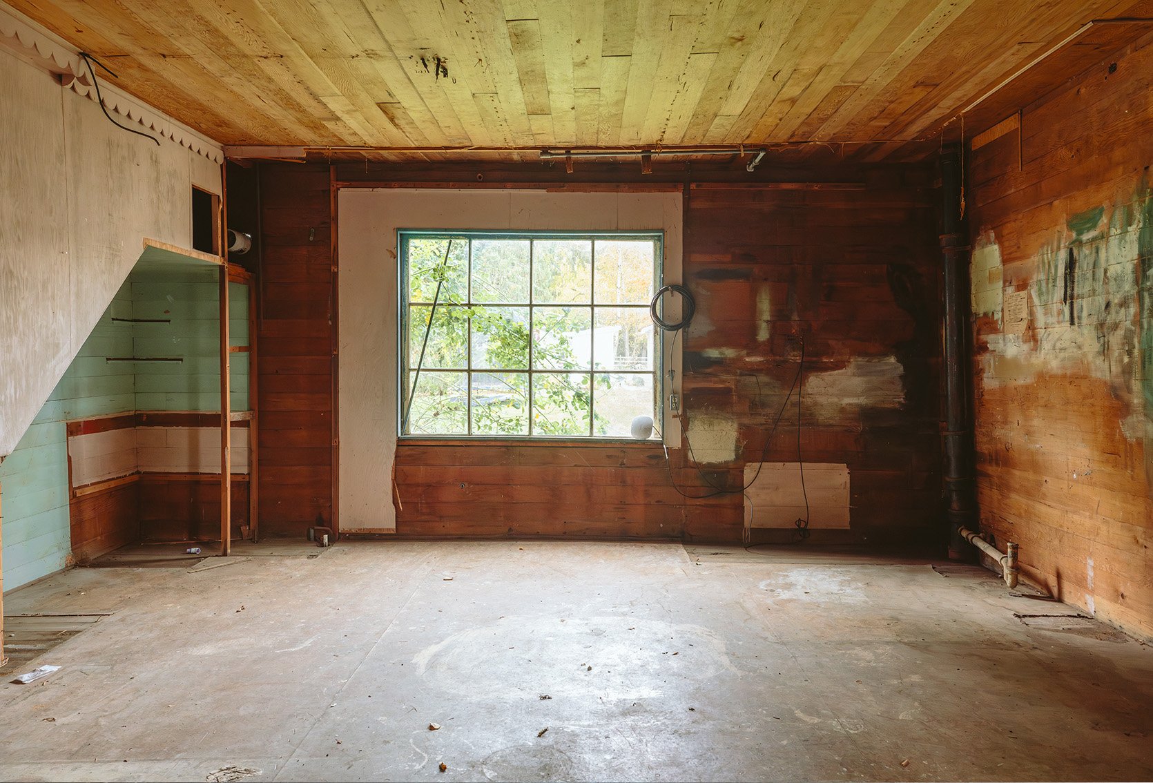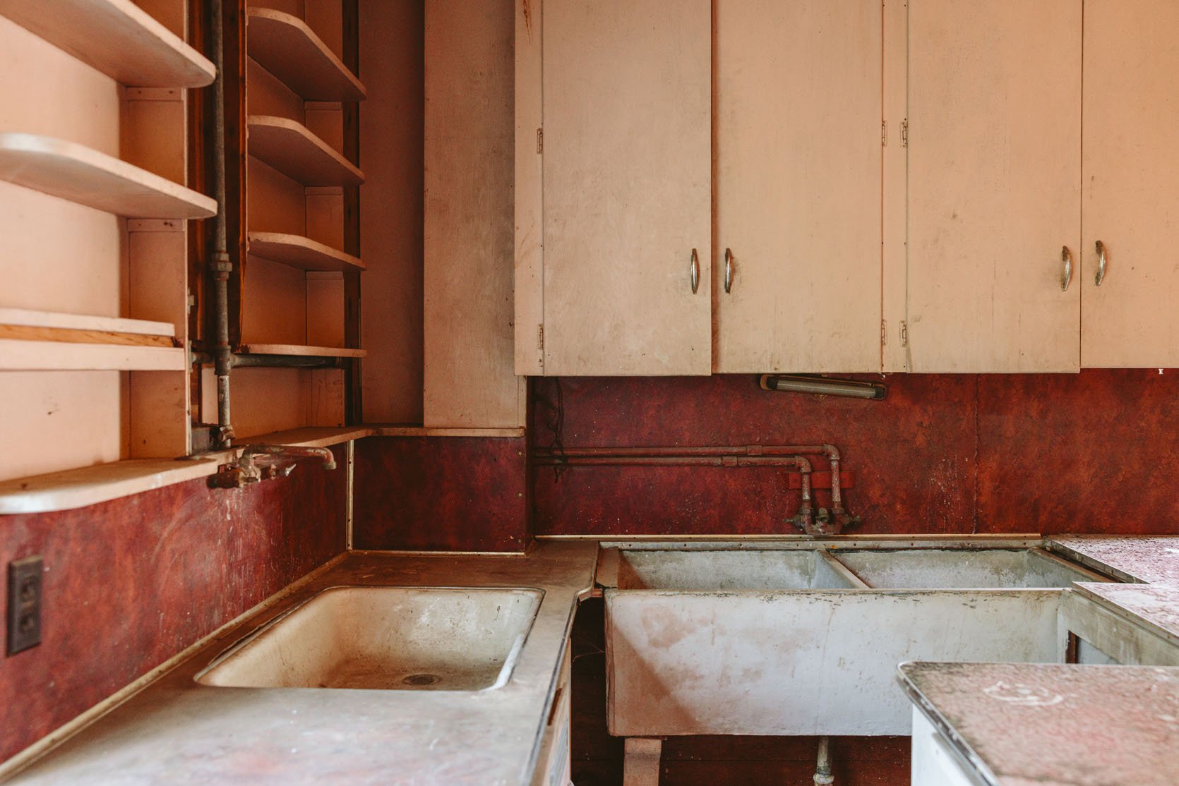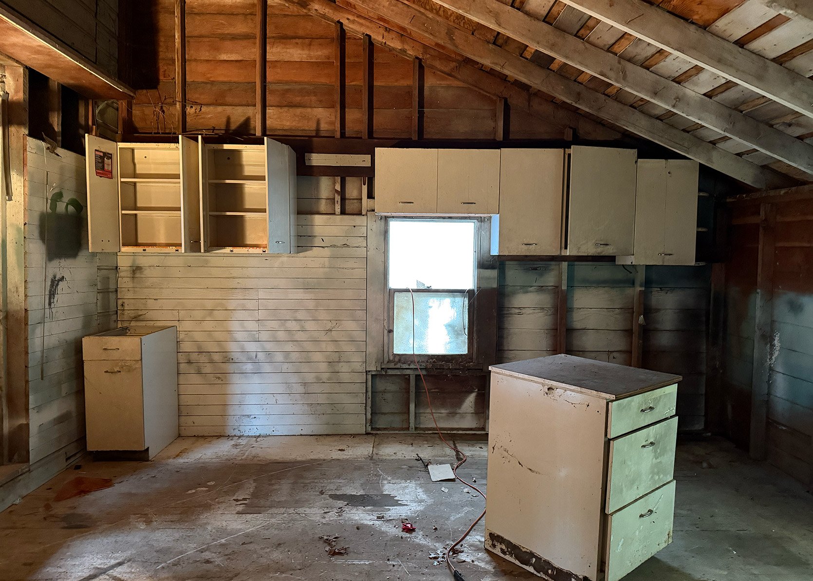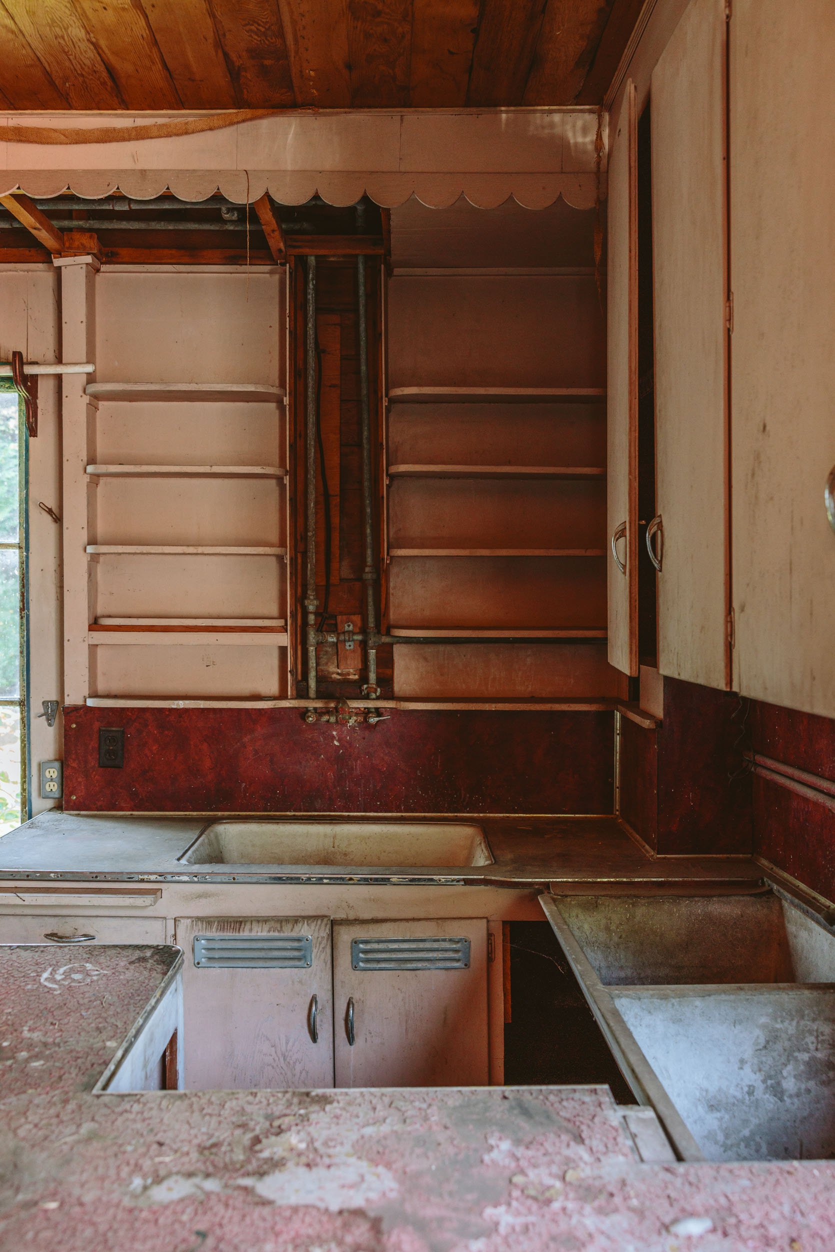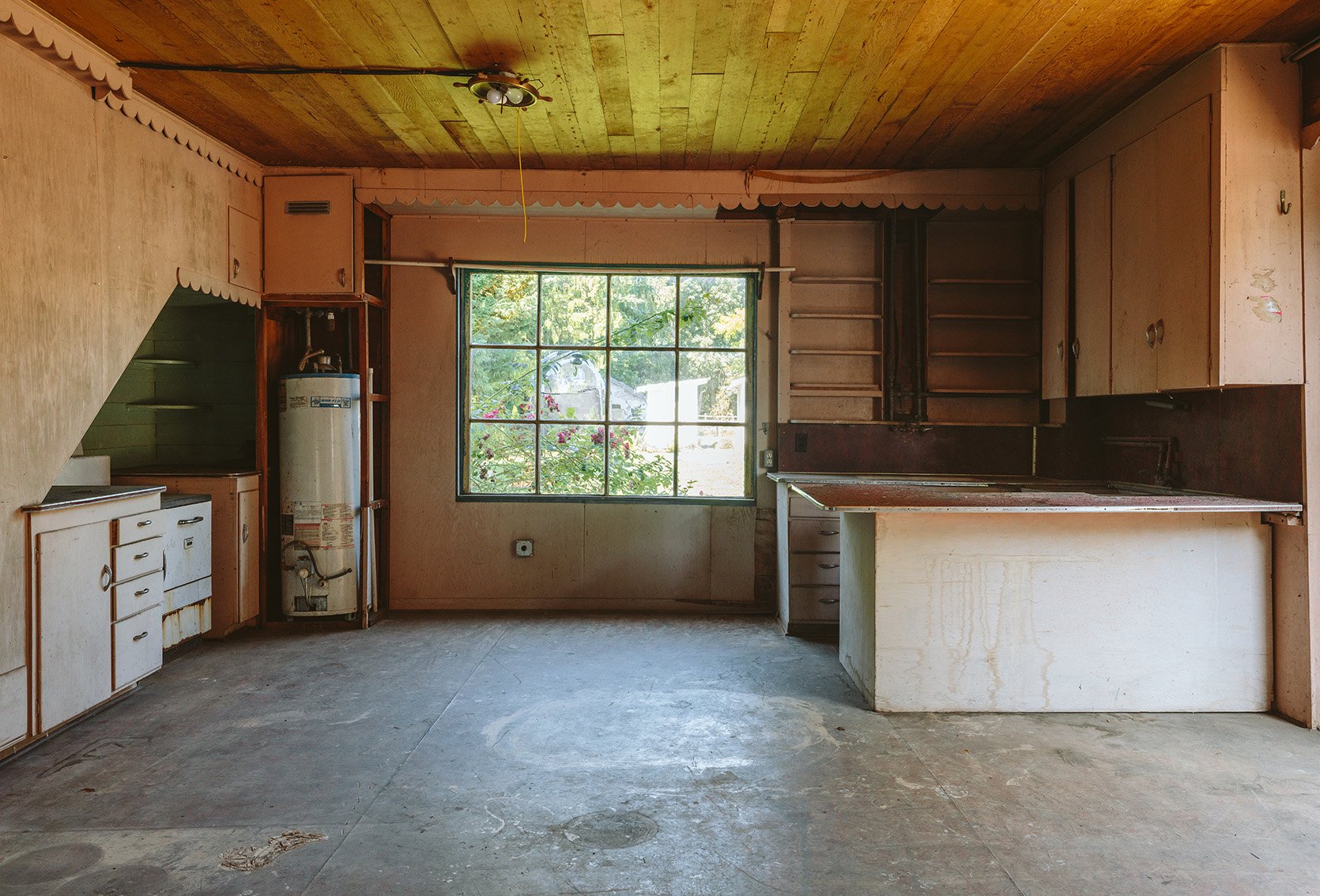 This room had all the aluminum cabinetry from the 40s or 50s, not in the best shape. They were actually super easy to remove and really lightweight. It’s a really big room with high ceilings and walls/ceilings that need to be repaired (and done properly).