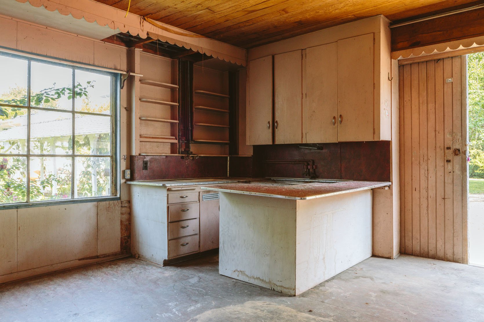 The kitchen was teeny tiny and in very vintage condition. It all had to go, and only the floating shelving was usable.