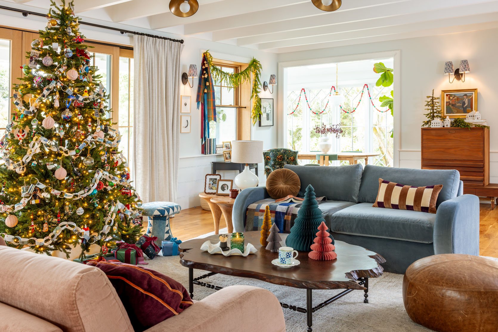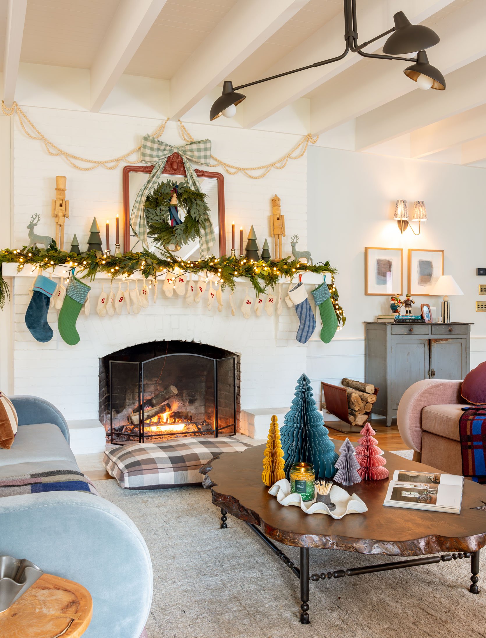 Last year, we skipped shooting our house decked out for Christmas because it looked exactly like the year before (so why spend the time or money?). But this year, with the advent of two new pieces of furniture (our awesome Barb sofas), I felt excited to decorate, show, and tell. But November is pretty much March Madness for content creators, so I didn’t have time to really plan; instead just winged it with what I had in the garage and a trip to the Mill End Fabric store. So despite thinking I could just pull it together, the day of the shoot was rough (at first). The first big pulled back shot took no less than 2 hours to finalize. Like one shot, styled 80 different tiny changes (if I didn’t love this so much, it would be truly maddening). I tried every combination of pillows, throws, coffee table accessories, and it wasn’t until we hit this version above, with pops of pinks and ochres, that it came together. It wasn’t what I had predicted (I thought I was going to lean into the Ralph Lauren trend, but it just wasn’t working!!). So here we have a playful, whimsical, Scandi version of our living room with a family tree dripping with DIYs and sentimental ornaments. It’s extremely cozy and fun to be in.
