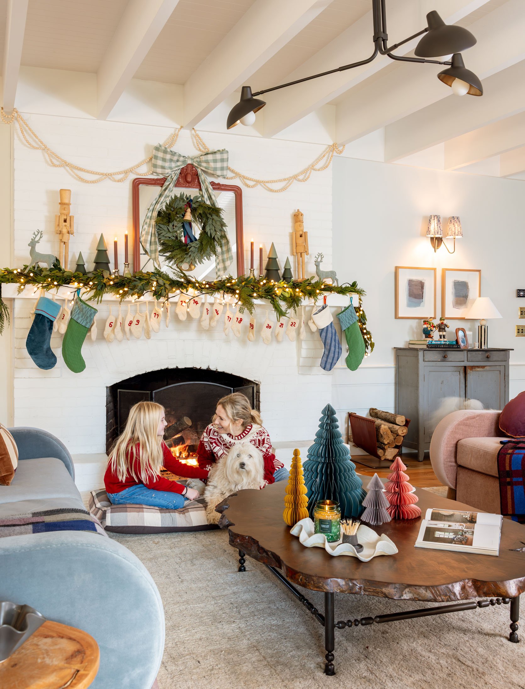 Most of the styling we already had, but we added the advent stocking (full of candy and kindness prompts), and we painted the black mirror a darker rose, which really softened the entire vignette in the best of ways. The faux tapers are still going strong, and the stockings from Schoolhouse are so playful and fun, while popping off the white so well. The big gingham bow is new (from Anthro), and the nutcrackers are old, from Michaels. It’s a lot, but it makes me pretty dang happy.