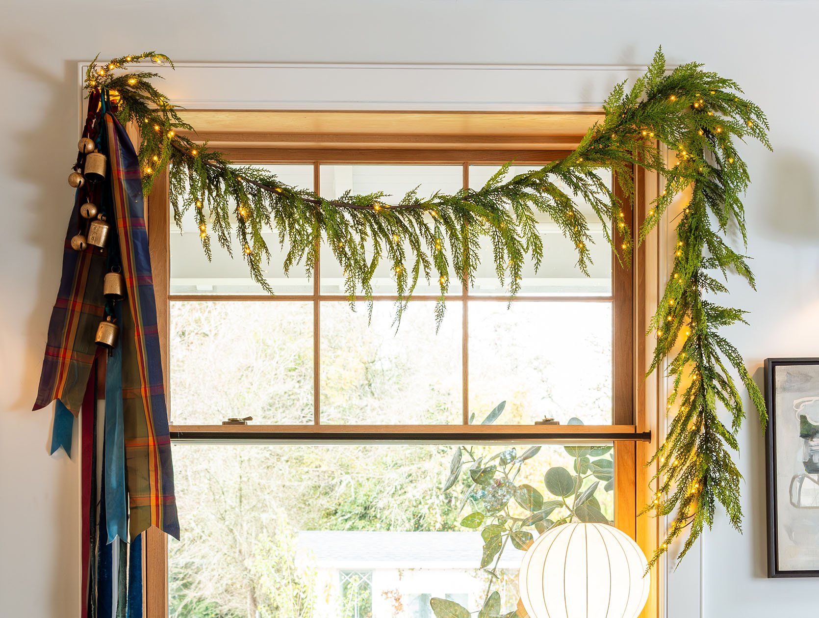 Pre-Lit Garland | Round Bells | Larger Bells | Blue Square Pillow | Green Plaid Blanket | Woven Basket | Blue Round Pillow | Burgundy Blanket