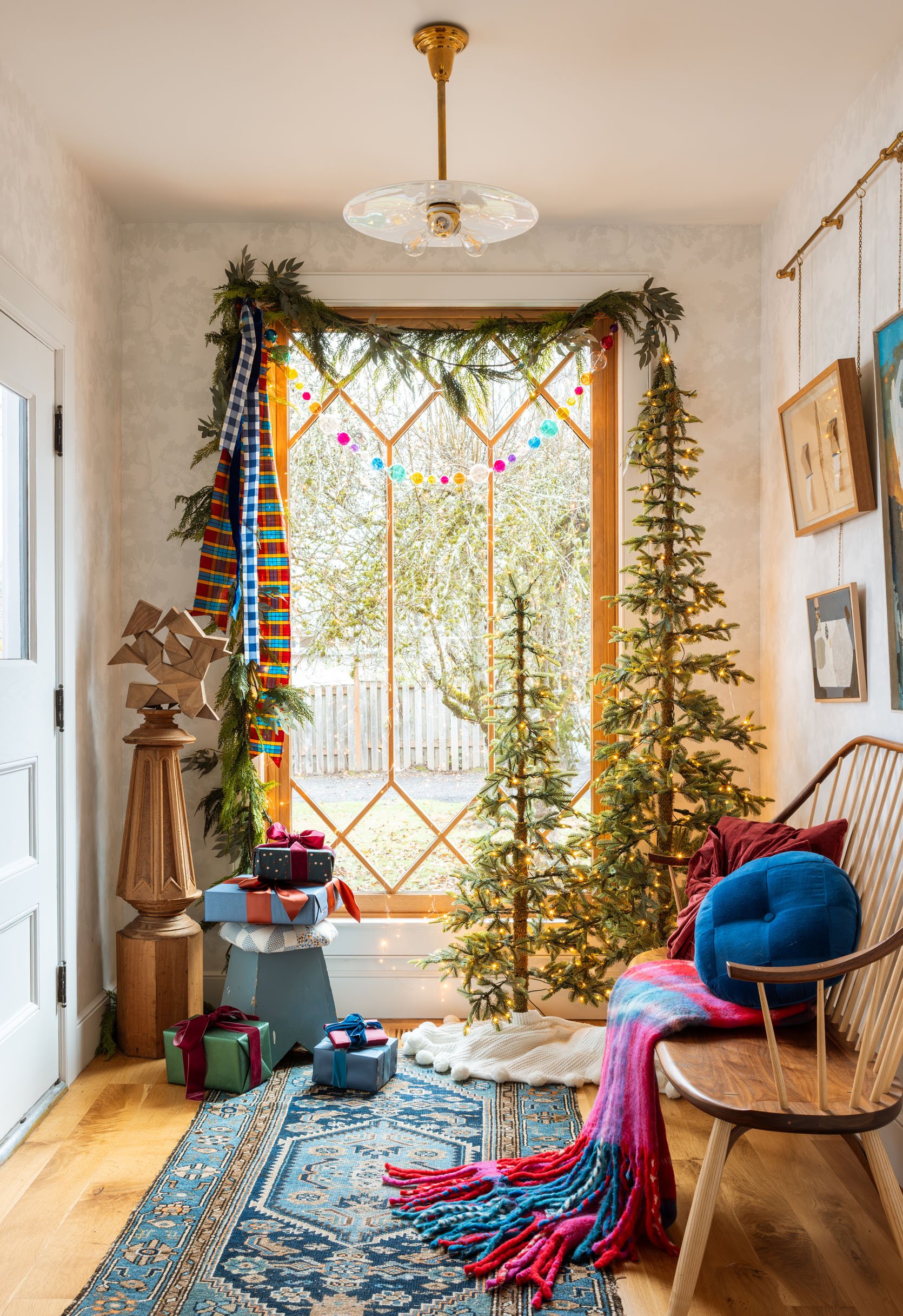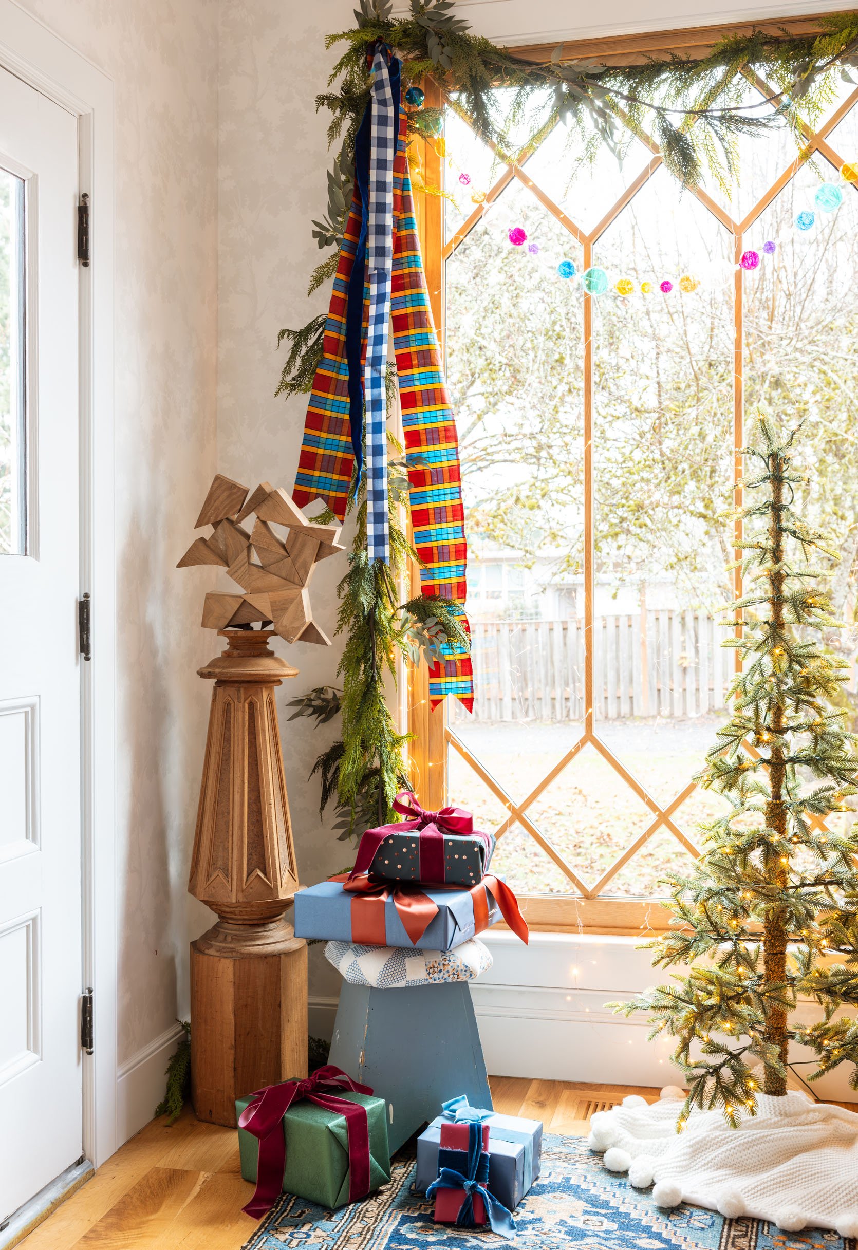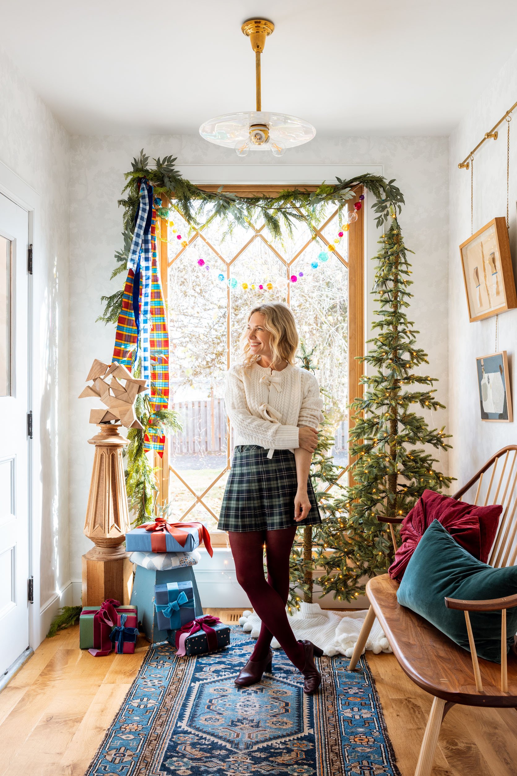 The entry is a dream to shoot, and Kaitlin always nails it. This year, I bought yardage of plaid taffeta (fashion fabric) and ripped it into wide and long ribbons. I love how they pop in the light, and it ties that incredible Anthropologie blanket and Schoolhouse pillow (Target pillow behind it!).