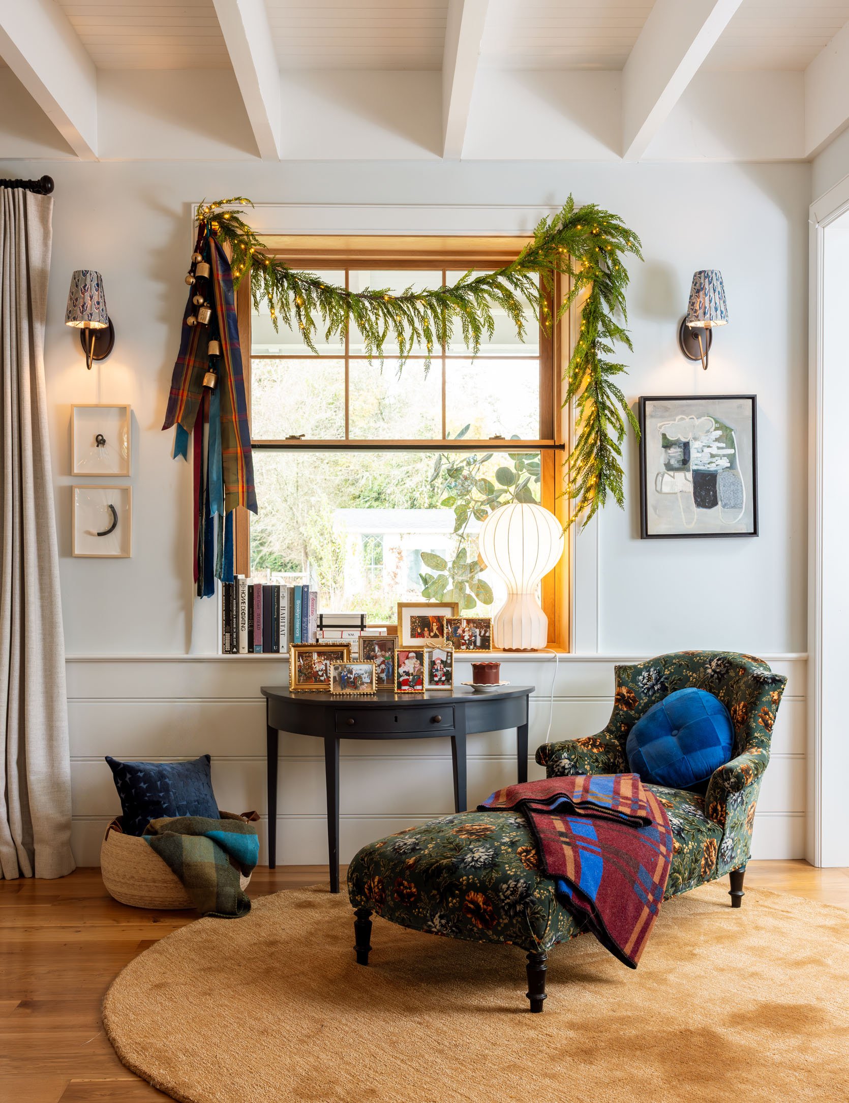 I LOVE this vignette. No one ever sits here, but every time I walk down the stairs, I see it and get that burst of dopamine that only style junkies have. I added more books and frames to give it a cozy library feel (all the gold frames are filled with Santa photos from over the years – a FANTASTIC hack and tradition that is not too late to do). I also really love the juxtaposition of the floral trad chaise and the more modern lamp, with the hits of cobalt from the Schoolhouse pillow and throw.