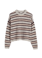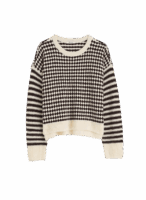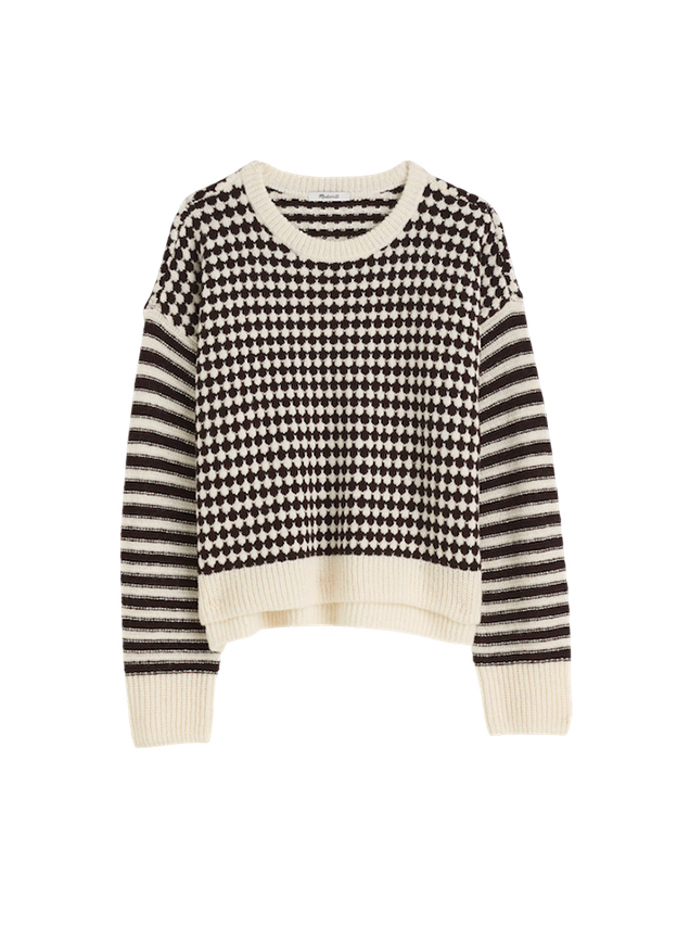 The black and white sweater is so easy to wear, layer over or under, and the multi-stripe makes it not boring.