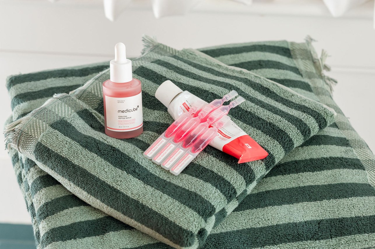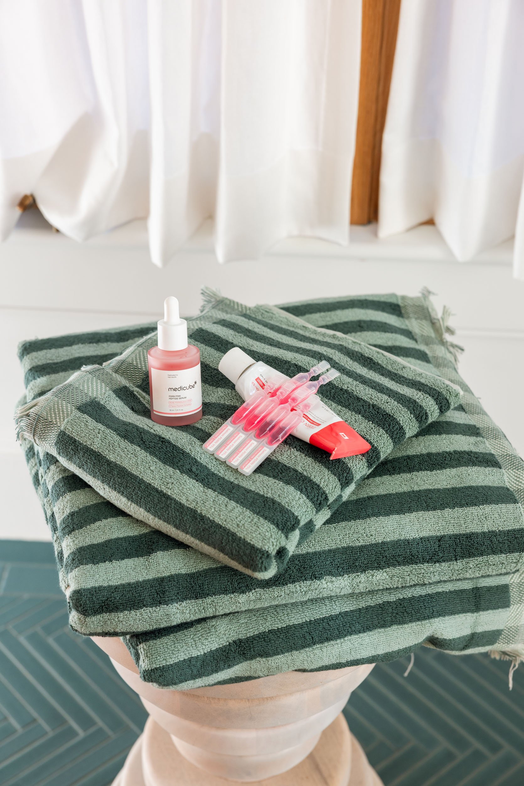 I’ve dove into Korean beauty products lately (I’m clearly not alone) and these are what I’m absolutely loving. All three do similar things with salmon DNA/sperm, and they plump you up and add a glow that looks instant and incredible. It’s honestly remarkable the difference. I also love these green striped towels from Anthro.