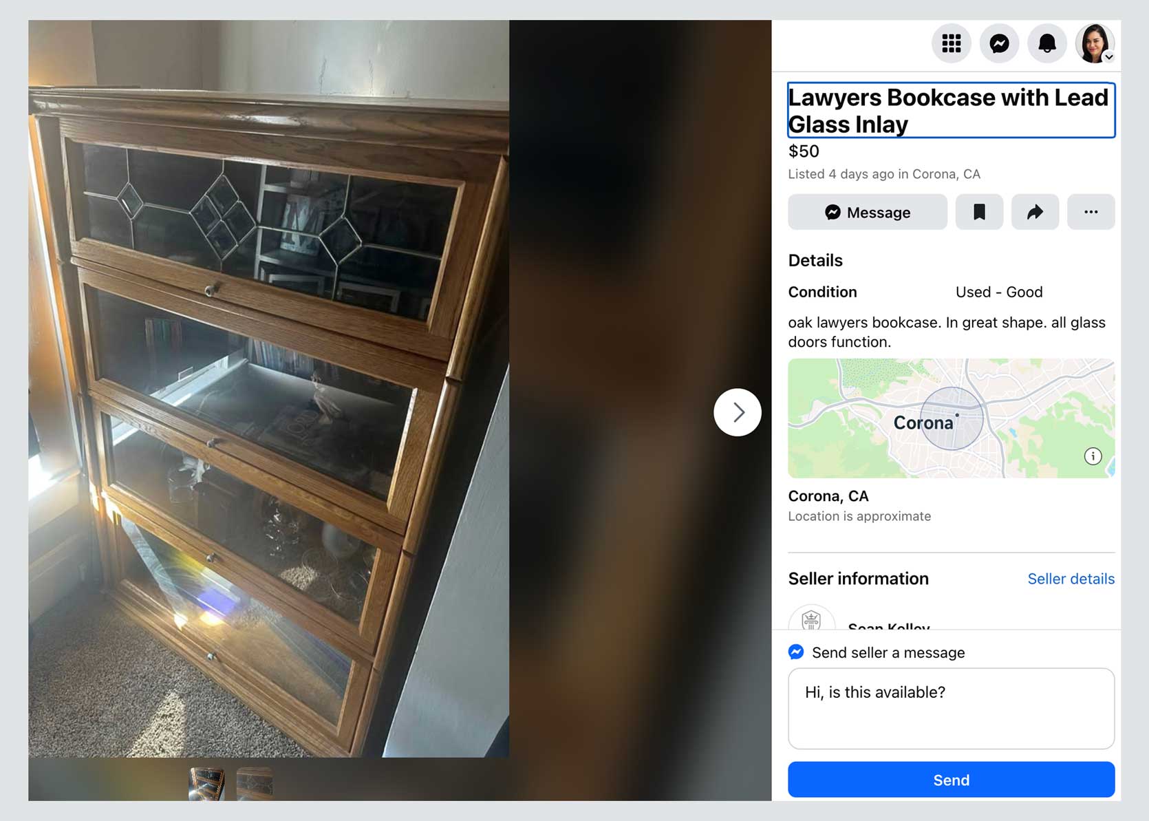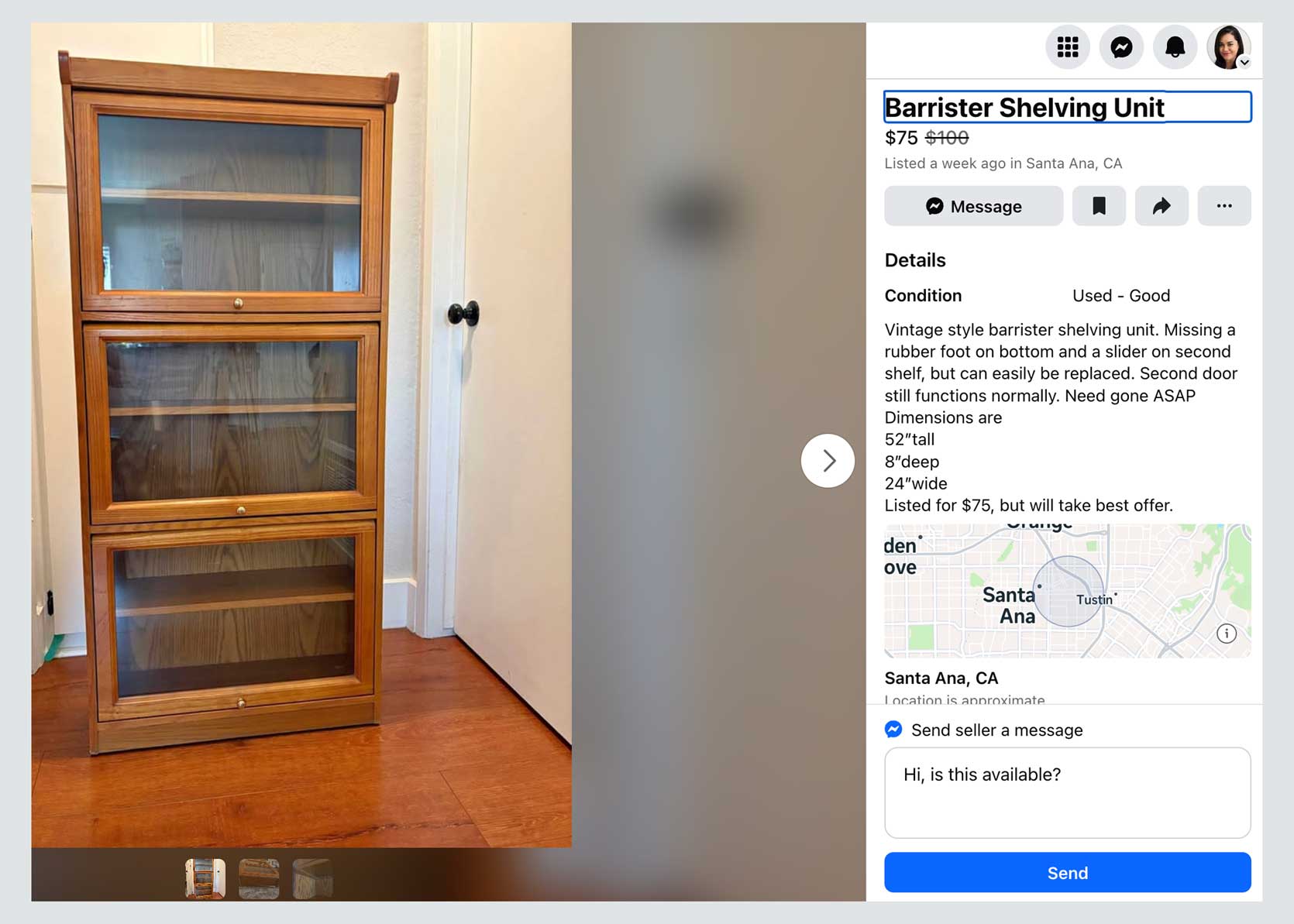 You may find that some listers get the name right, but it’s unclear if it’s an antique or what the above seller is calling “vintage style.” That’s kind of the name of the game with peer-to-peer marketplaces. People are posting things however they think best, so just be sure to ask some questions about the construction, age, and condition. The most common issue is the functionality of the sliding glass doors.