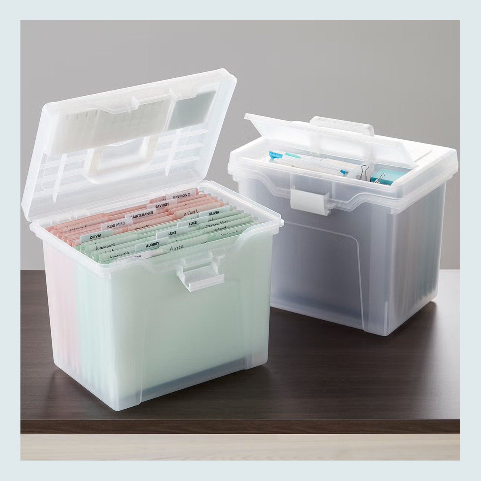 This blue file box is another piece I personally own. It holds a shocking amount of paperwork, and it’s held up great for the past couple of years. 10/10 if you don’t have space for an actual cabinet. If you want something a little more grab-and-go, this portable file box with lid organizer is perfect for that, with its top handle (and the fact that it’s slimmer).