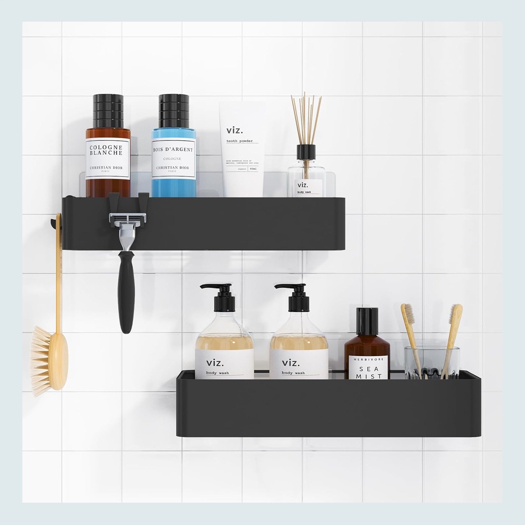 Personally, I’m not the biggest fan of the “floor to ceiling” corner shower caddies. Of course, that doesn’t make them bad, and I’m sure there are great ones I’d like, but if you need more shower storage, consider wall shelves like these. The wicker one is pretty freaking cute and totally waterproof! No drilling required.