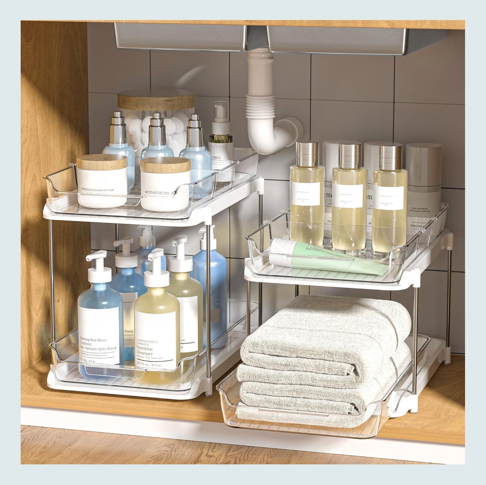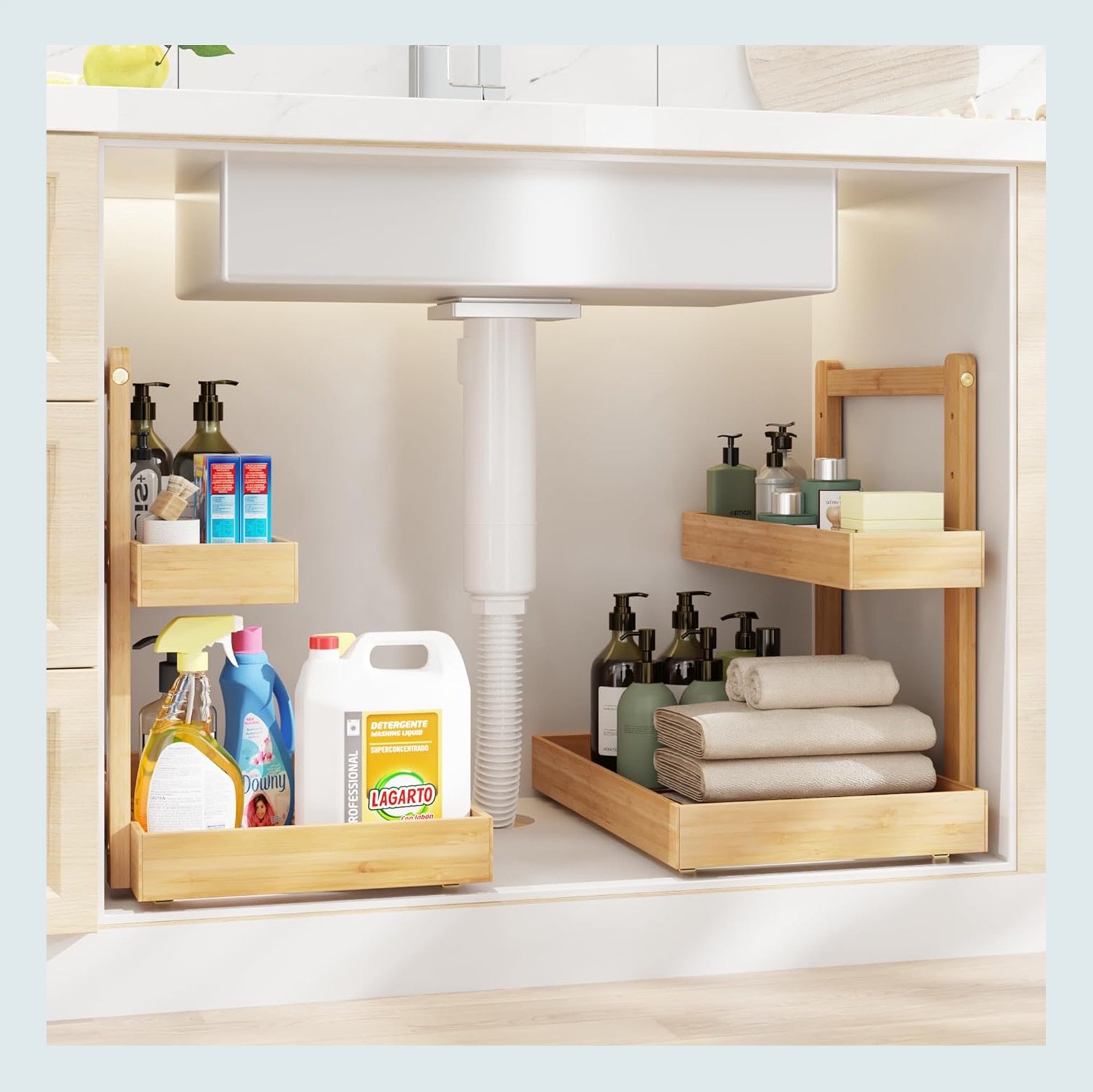 Bamboo Under Sink Organizer | 2 Tier Slide Out Sink Shelf Cabinet Storage Shelves