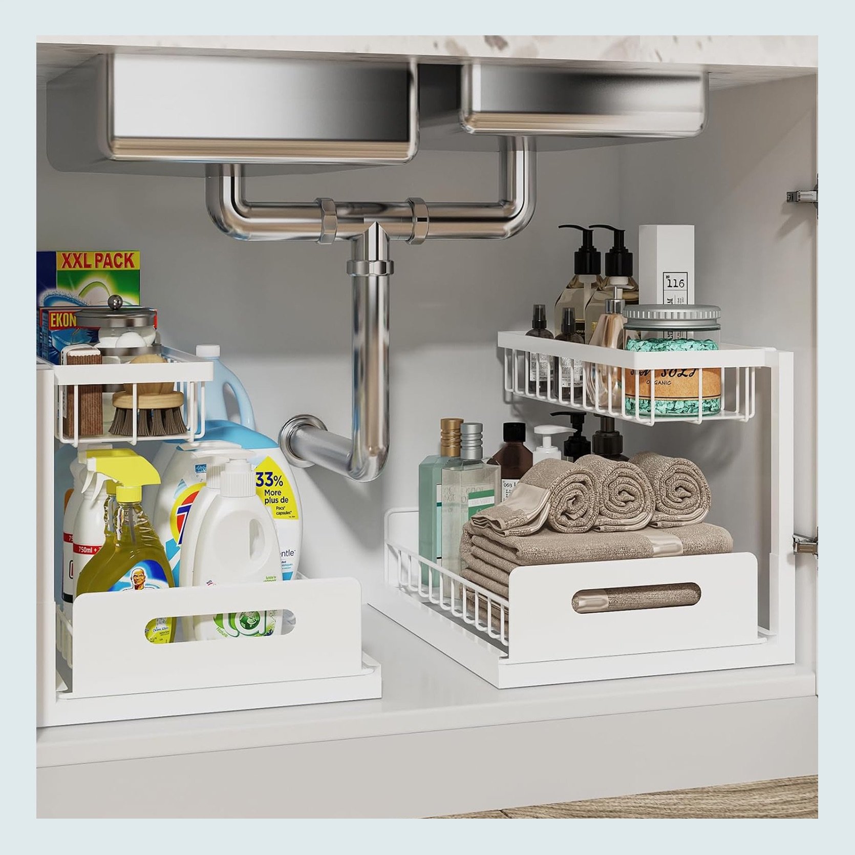 So, depending on what plumbing setup you have under your sink, these two could also be really great options. I chose the black metal one because it was more slender and the white/clear one because it’s wider, so it can hold more. Something for everyone (I hope:))!