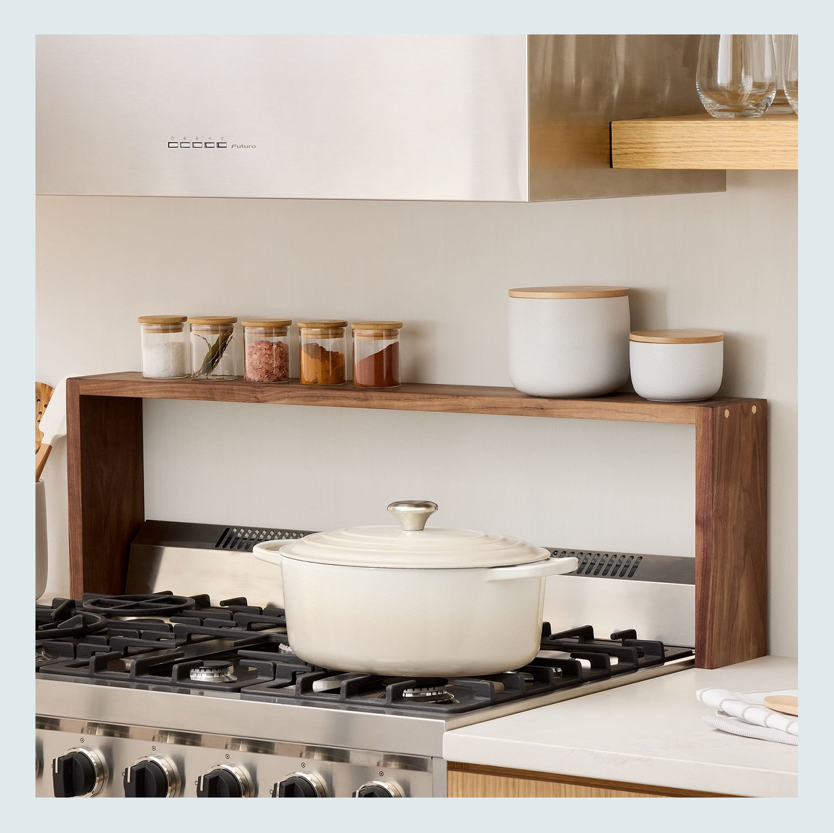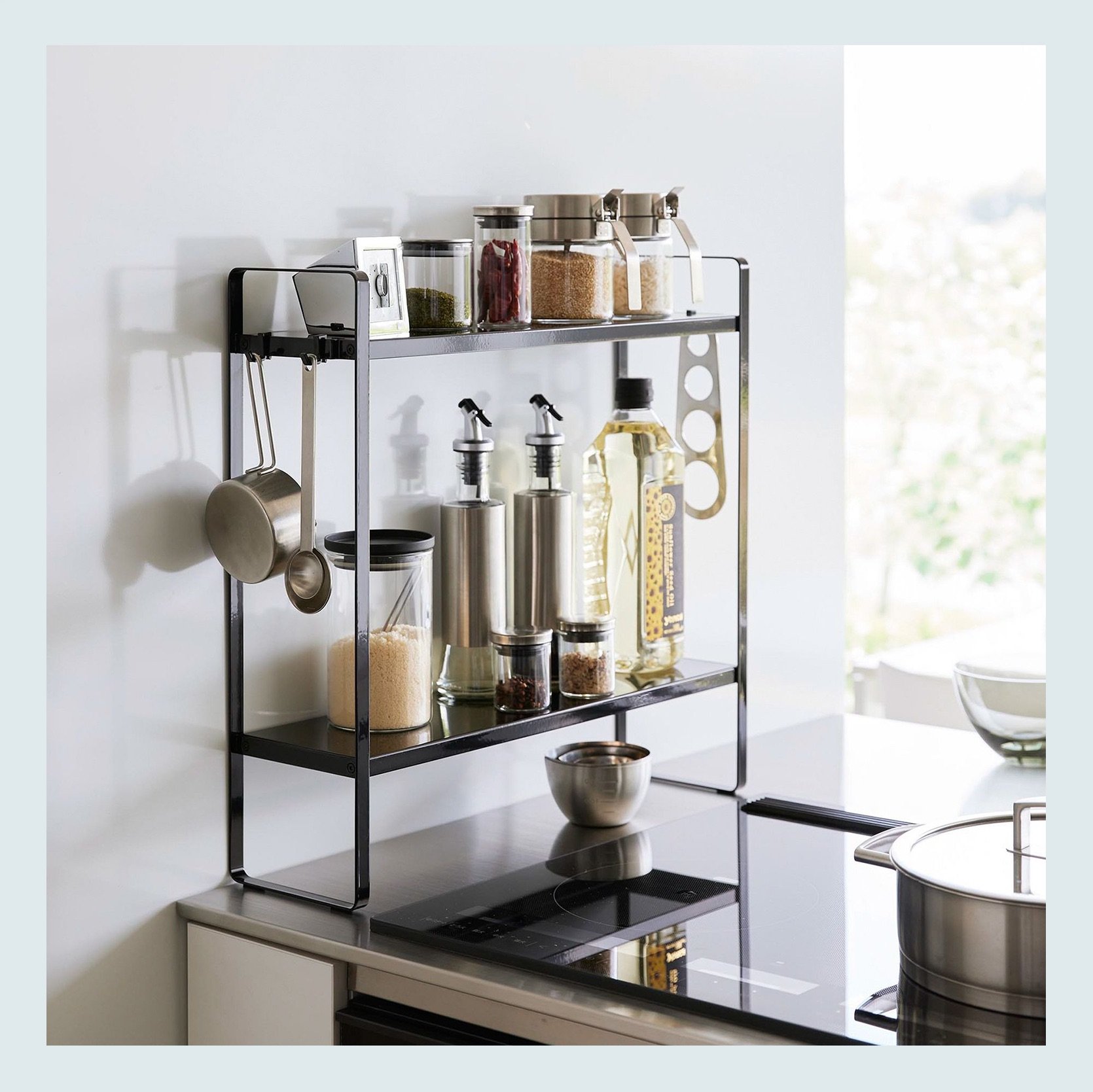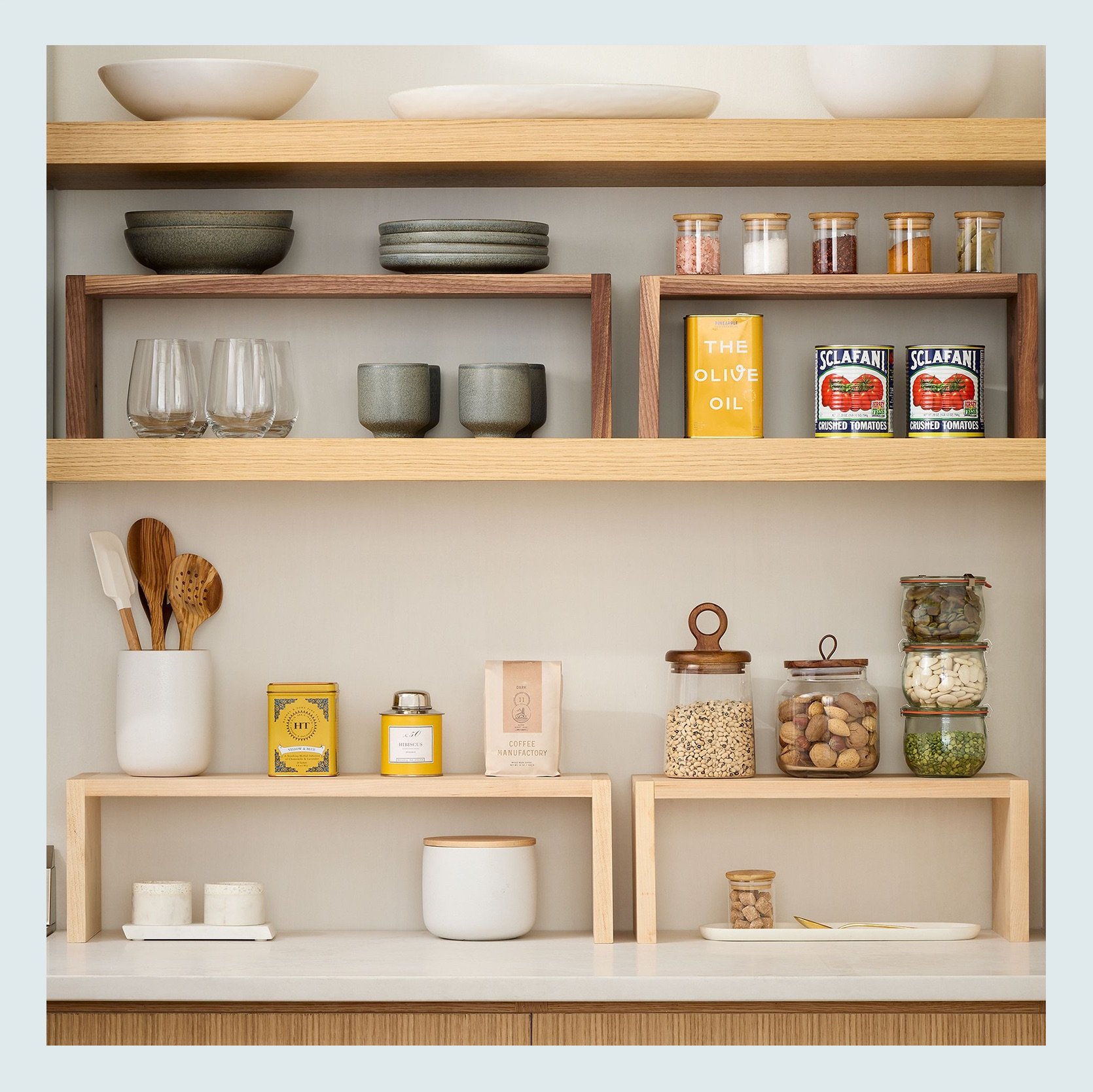 Risers are SO underrated. We can take advantage of vertical space in any space, including the kitchen. These risers, in particular, are very beautiful and on the pricer side, but they really add to the design in a very intentional way. Just a suggestion:)