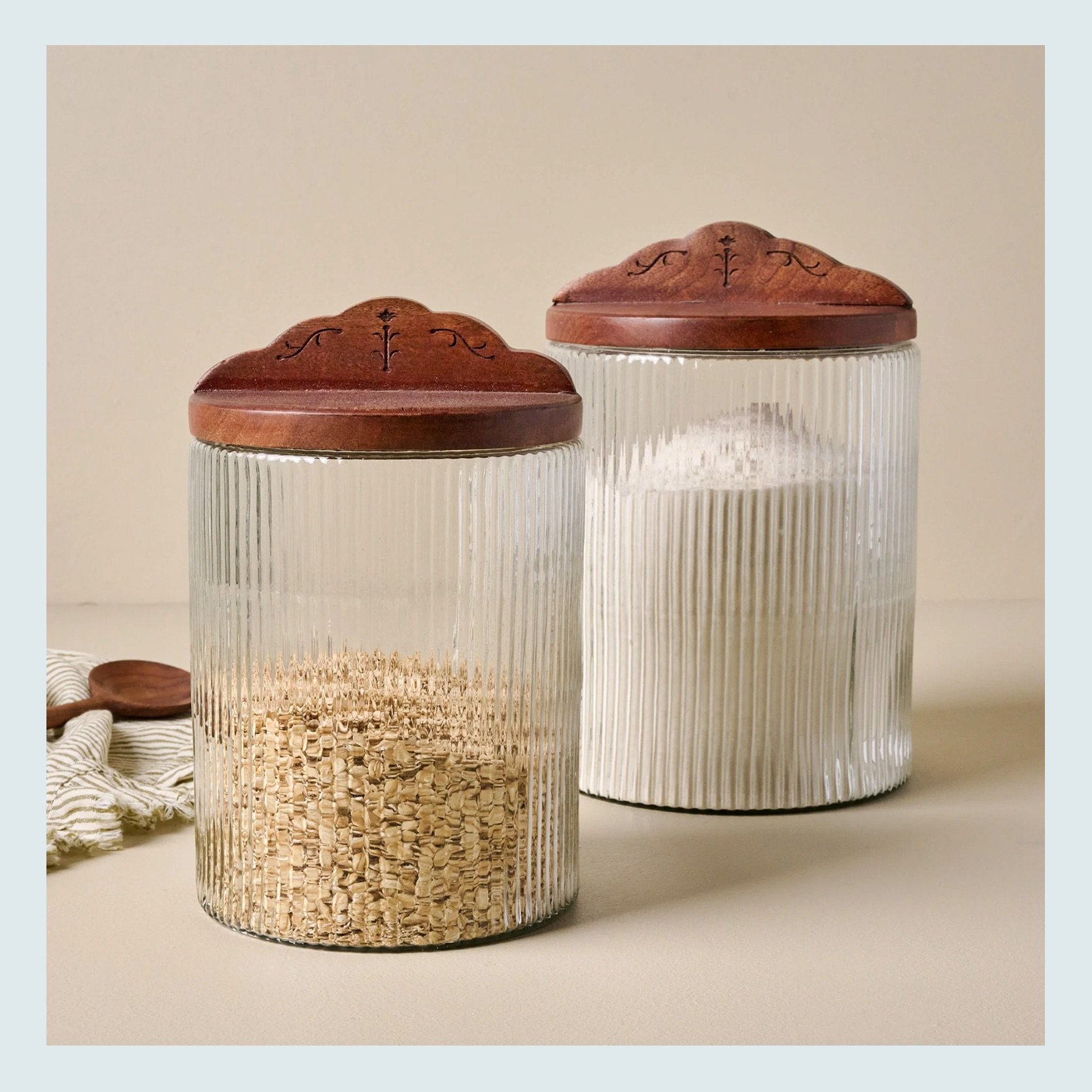 Glass Storage Jars with Airtight Lids | Cylindrical Jar | Antiqued Wood Ribbed Glass Canister