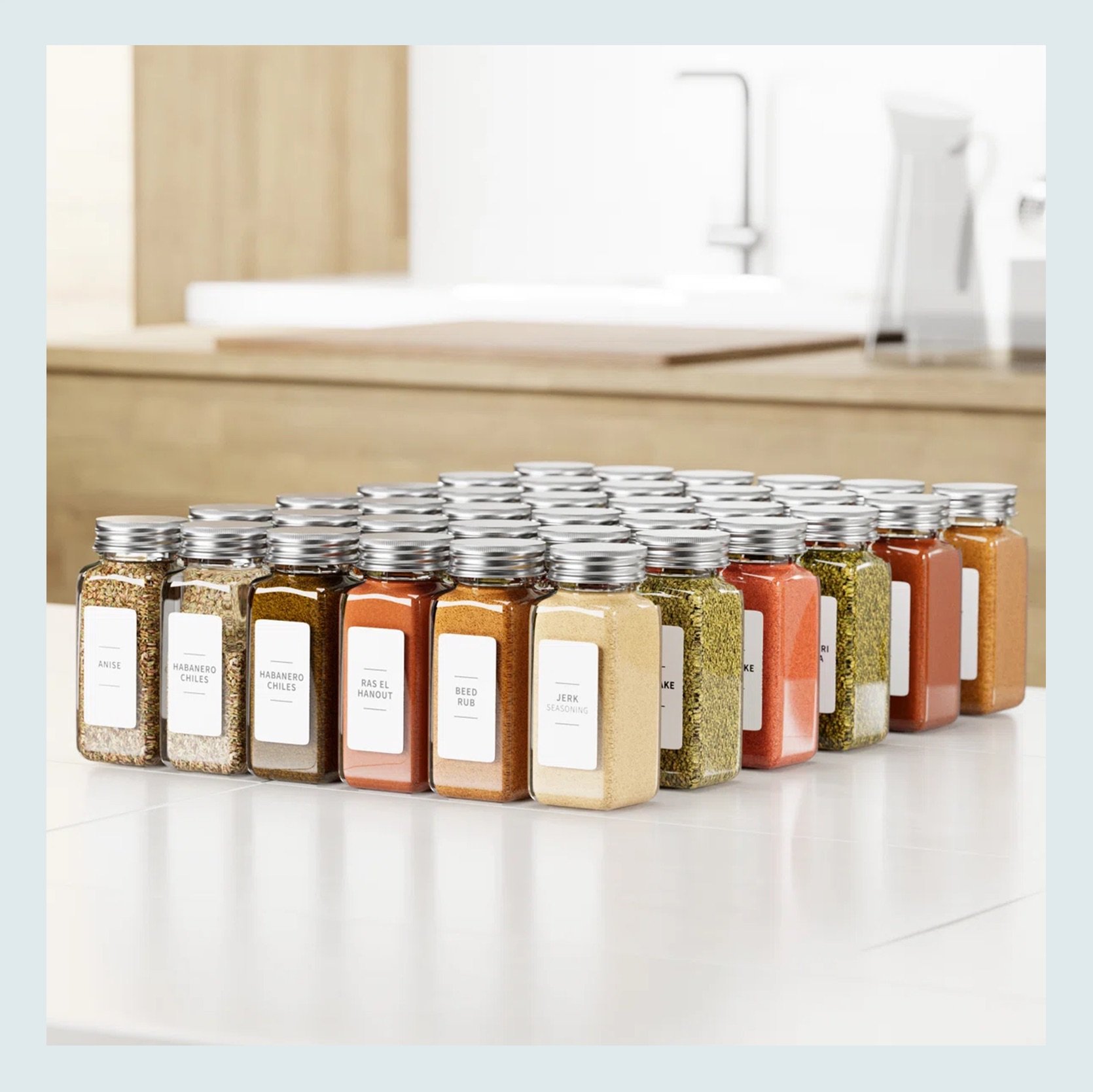 Glass Spice Jar Set with Labels (Set of 36) | Expandable Spice Drawer Organizer