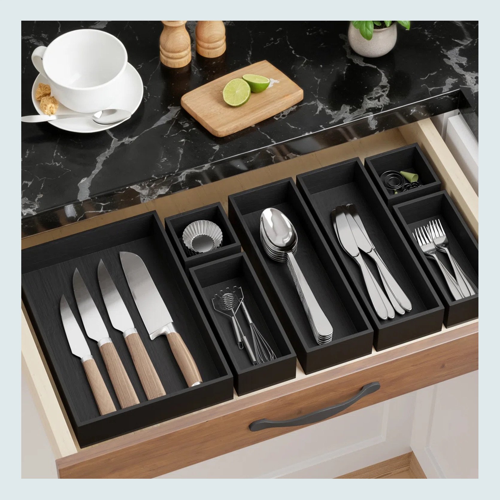 DO NOT UNDERESTIMATE the power of a kitchen drawer organizer. I have oddly large and deep kitchen drawers and once I truly created a great system, every day thereafter was better:) Both of these products are great and give you a lot of options.