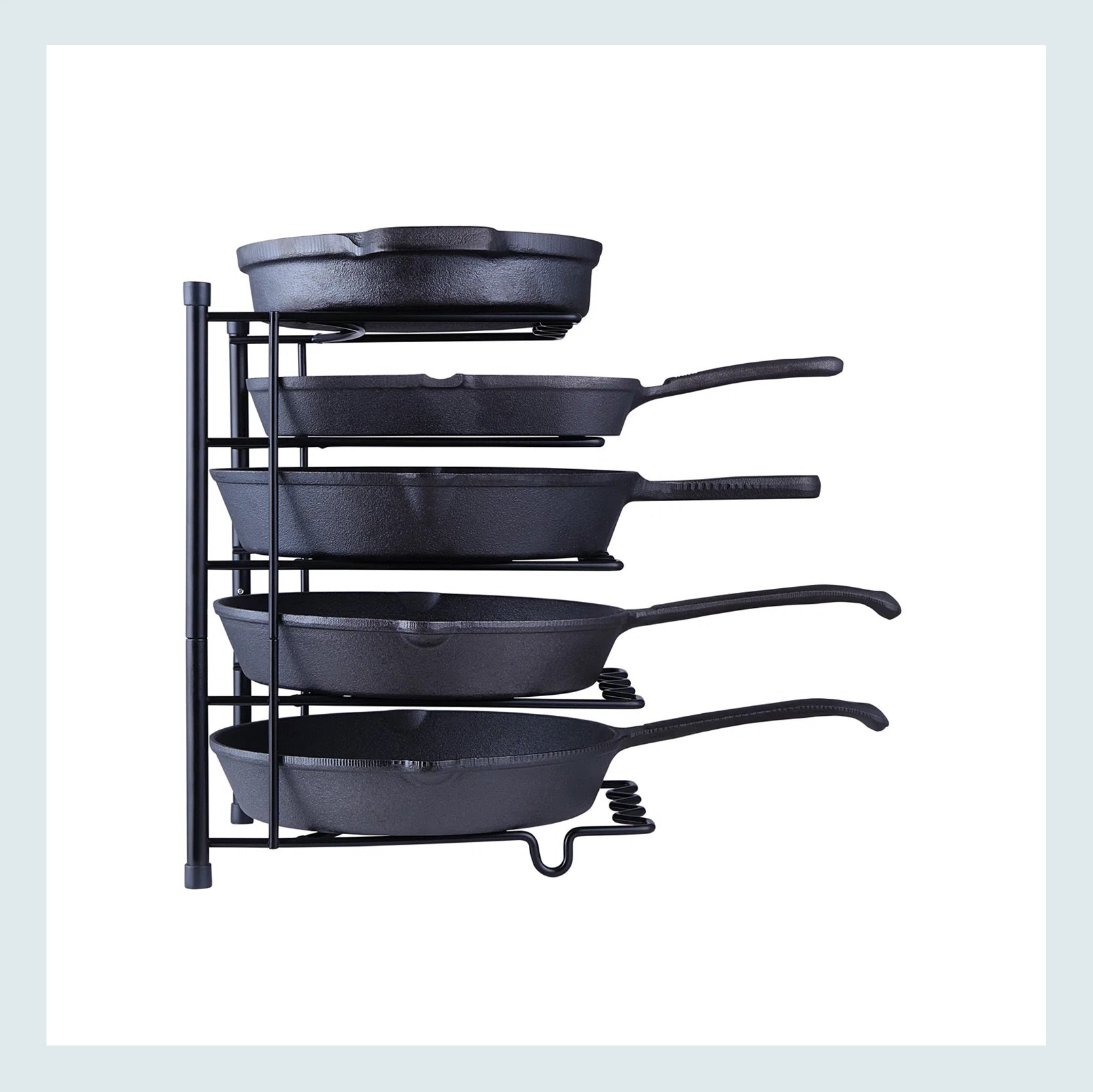 I own this in-drawer knife block organizer, and it’s awesome. Then this pan divider is simple, but it’s great that it can actually handle heavy pieces.