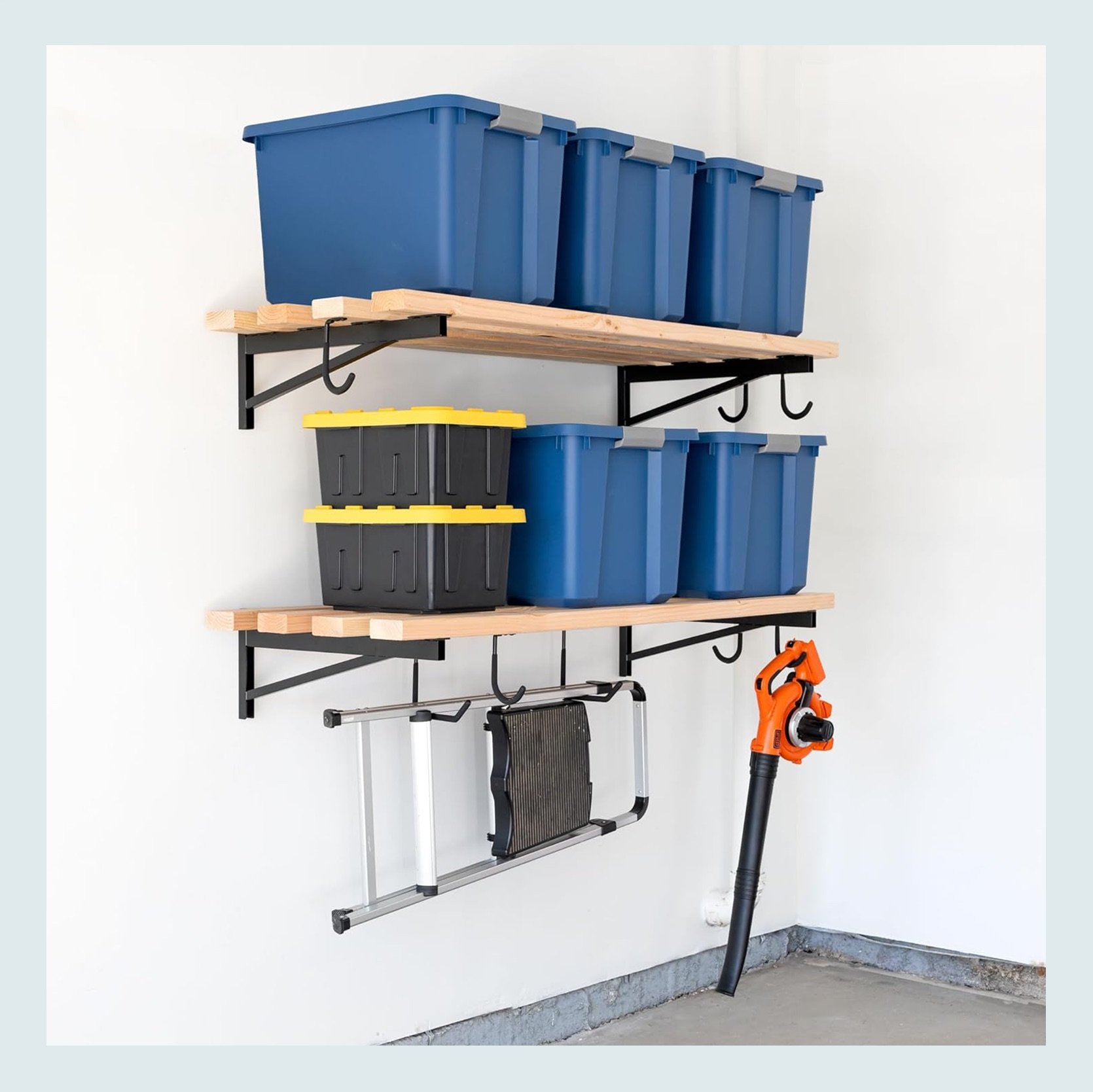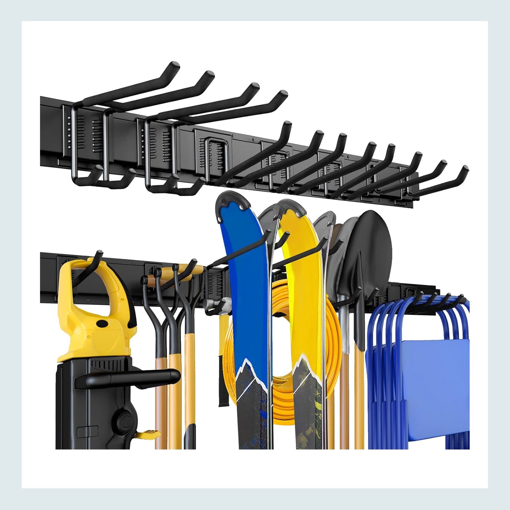 When organizing your garage, absolutely USE THE WALLS. It frees up space on the floor, and as you can see from these cool organization products, it really makes of difference, and they can hold A LOT.