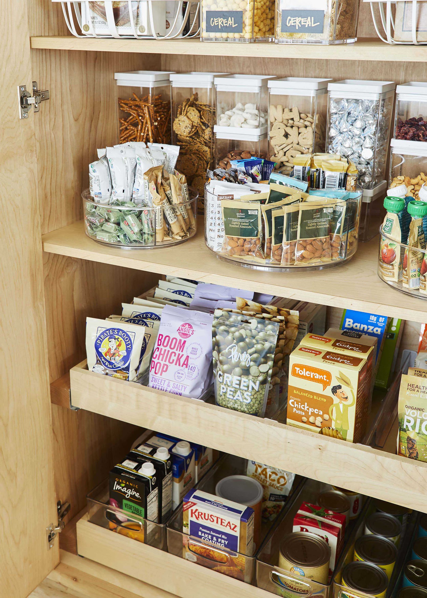 I have a deep pantry too. I use the large multipurpose bins from the Container Store to corral boxed items like pasta. And Youcopia makes these rollout fridge and pantry drawers that are awesome. They have little wheels on the back and are study enough to hold canned goods. I can easily pull them out to access the back of the pantry, where I stash bulk items like chicken stock and dried beans. At one point I thought about trying to install pullout shelves in my pantry, but I actually have more storage space with regular shelves and these bins!
