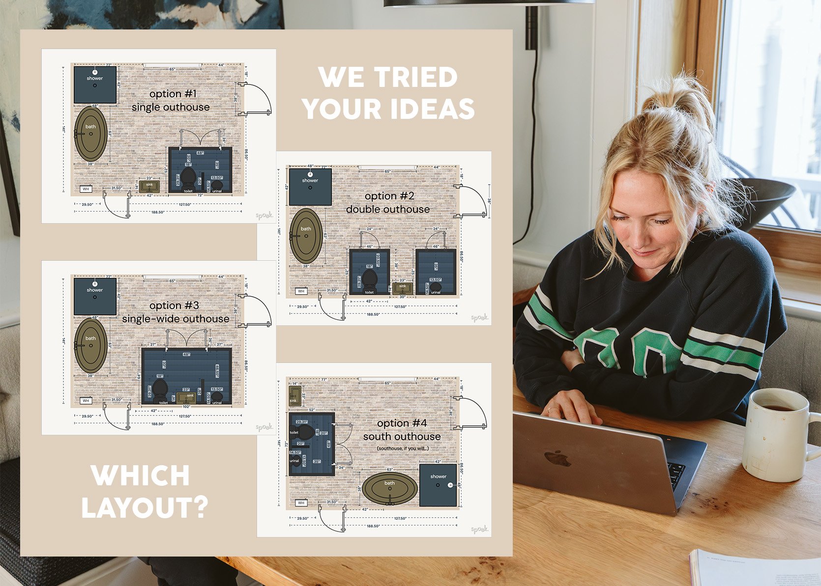 Option 2 is the cutest because women won’t have to “see” the urinal. But I understand it might be cramped with the sink. But it might be ok? Or maybe there’s another layout to have two outhouses plus a shower (and nix the tub or maybe have a shower/tub combo instead)? As a woman, the few times I’ve used a bathroom with a urinal (ie when the line for the ladies room is too long), I always feel grossed out looking at the urinal.