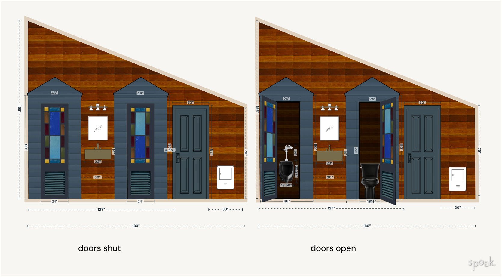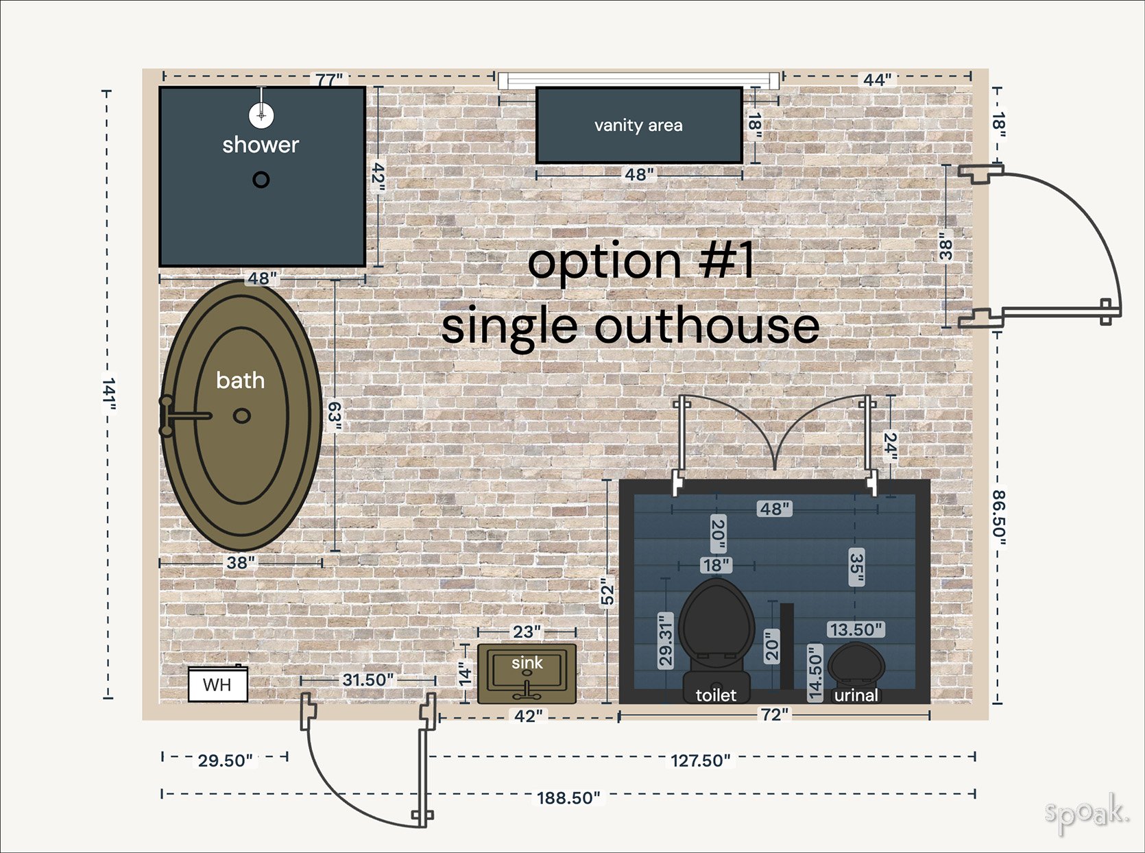 Pros: The larger shed is likely ADA-compliant. The door opening is 48″ with enough space inside to maneuver. I also love that the sink would be centered and the prettiest sightline when the doors are open. The toilet and urinal are separated by a sink.