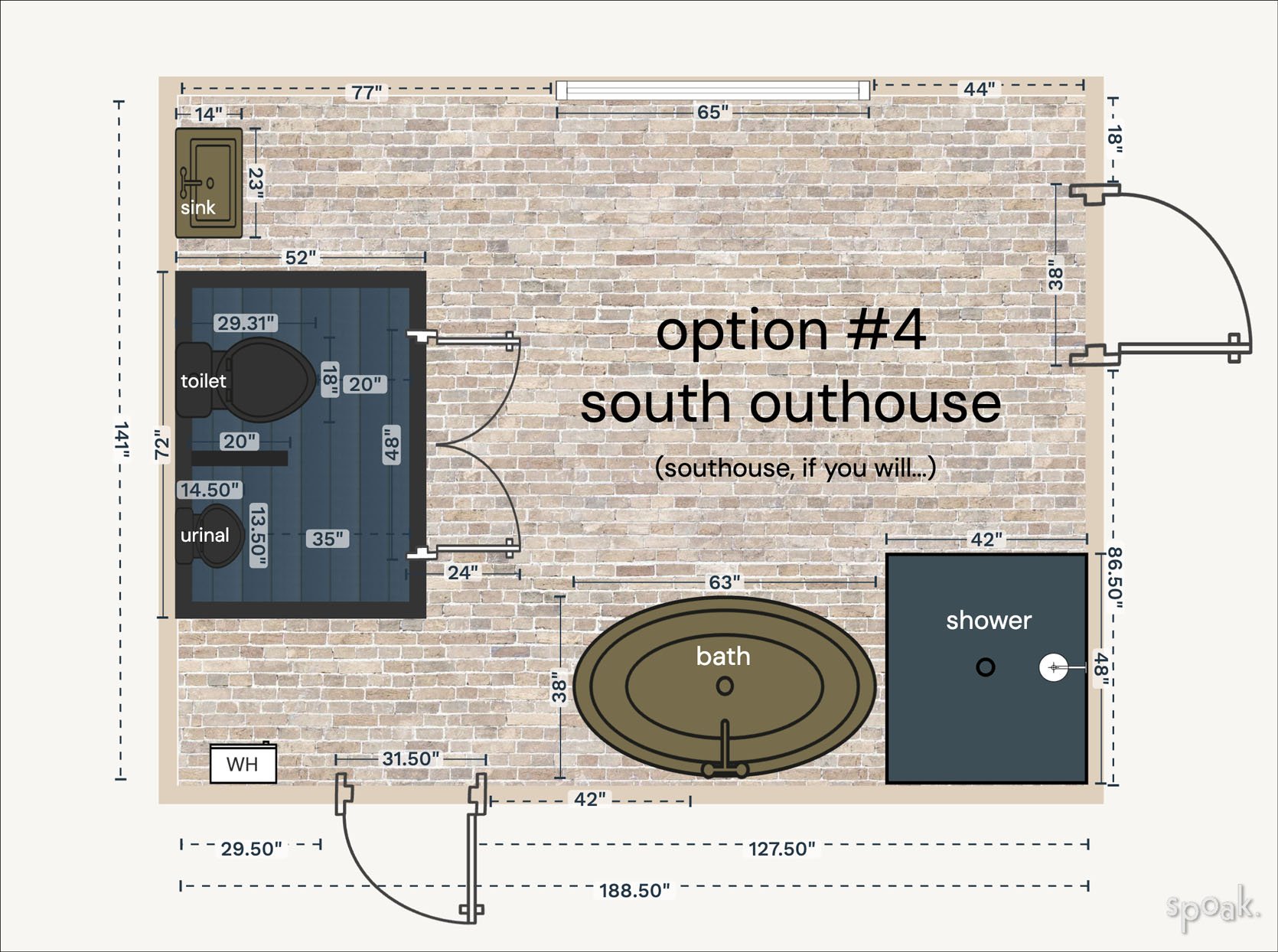 If I was a bridal party I’d find a urinal in a bathroom I was getting ready in pretty gross. I didn’t vote for any of the layouts because I don’t feel like you’ve nailed it yet. Having the sink outside the toilet doesn’t feel right because you have to open the door to wash your hands (which will make it feel like a public toilet). What will be the surround on the shower? I think this will be confusing because is it a powder room or a bathroom? Isn’t there going to be another bathroom upstairs? You could get rid of the shower and tub and make two big cute outhouse. Or get rid of the bath and have 3 super cute “outhouses” in a row like bathing boxes one with a shower one with a toilet and one with a urinal all along the west wall. Very intrigued where you will land on this.