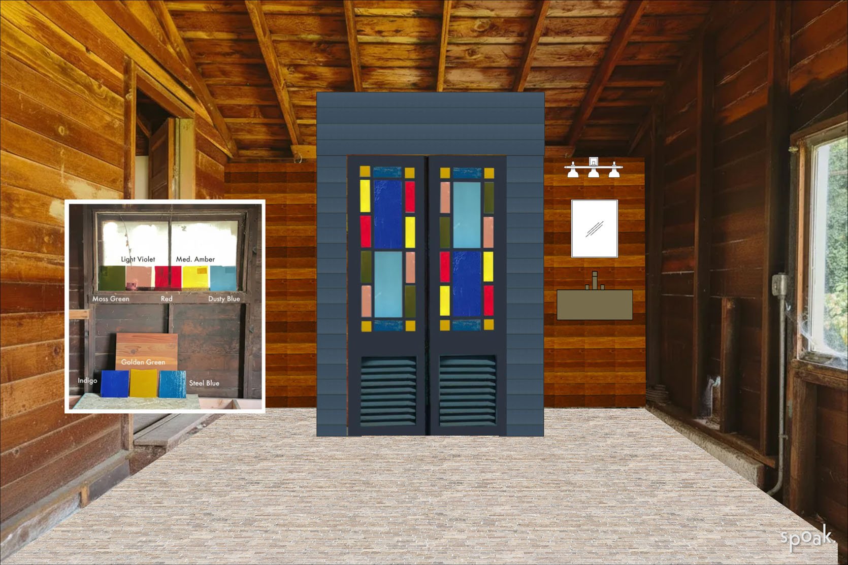 We wanted to address those of you who thought that stained glass would be pointless without a window or light source inside the outhouse to make the colors shine. We’ll call you “team outdated Pizza Hut” because you likened it to a Pizza Hut. While I don’t agree, we had this exact same conversation and temporarily relocated the outhouse a few weeks ago. There is a pretty bad window with a terrible view (of a chain link fence) that we had planned on getting rid of. But the idea crossed our mind to put the stained glass doors in front of it and see how that would look.