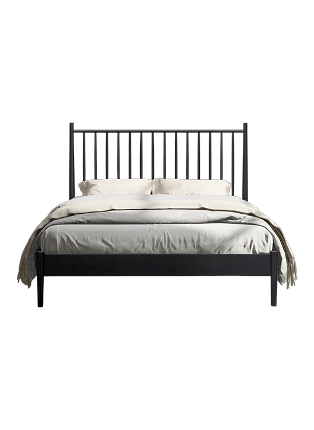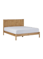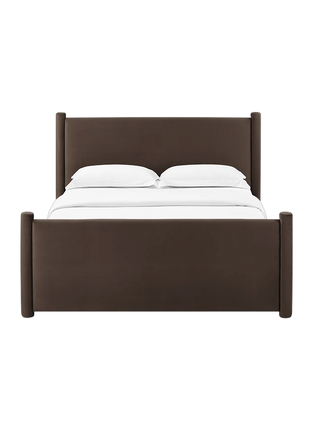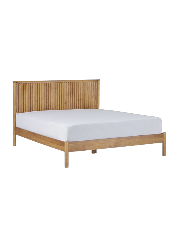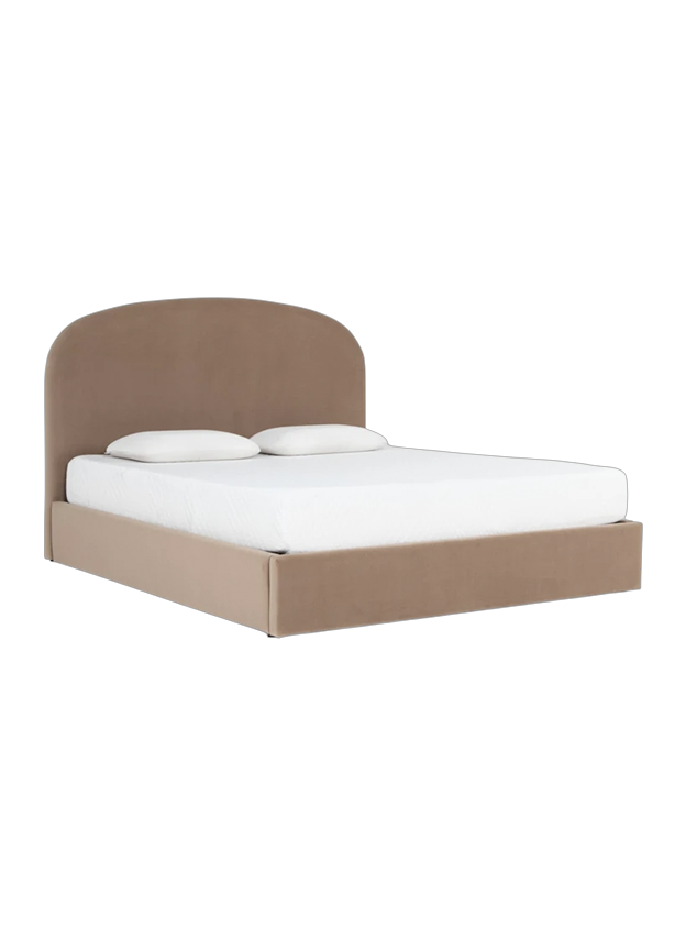 We are very into this type of arched headboard, and that color fabric is stunning, right? But if you are more into a wood bed, we love this solid wood, fluted headboard and base.