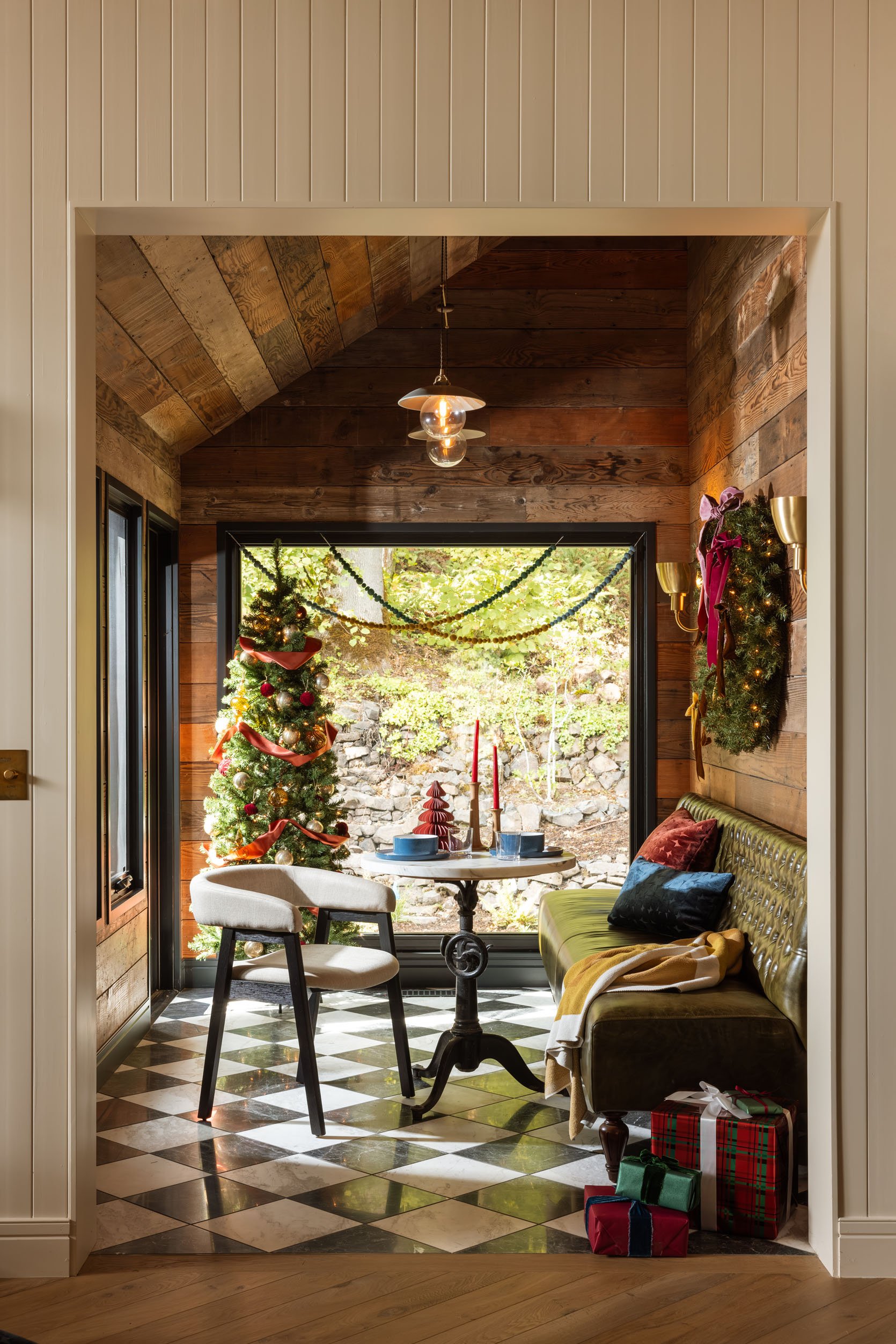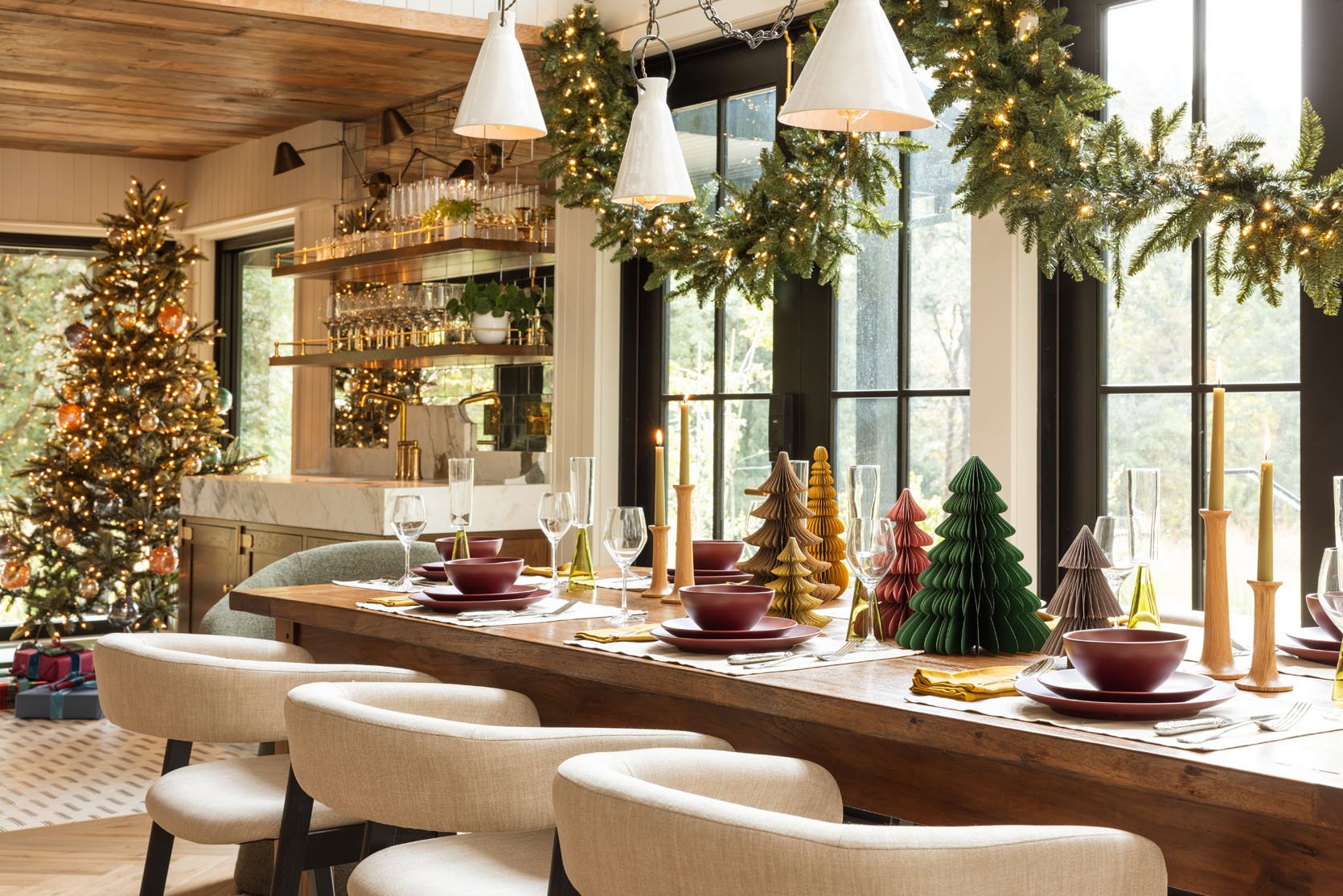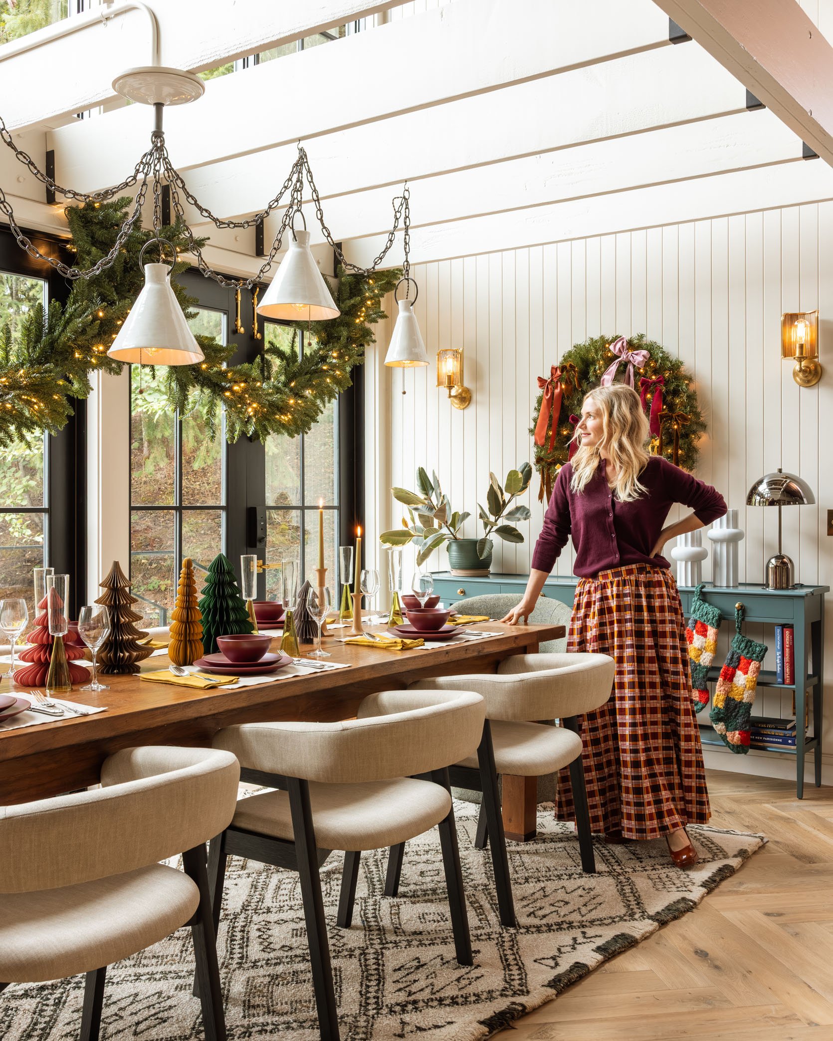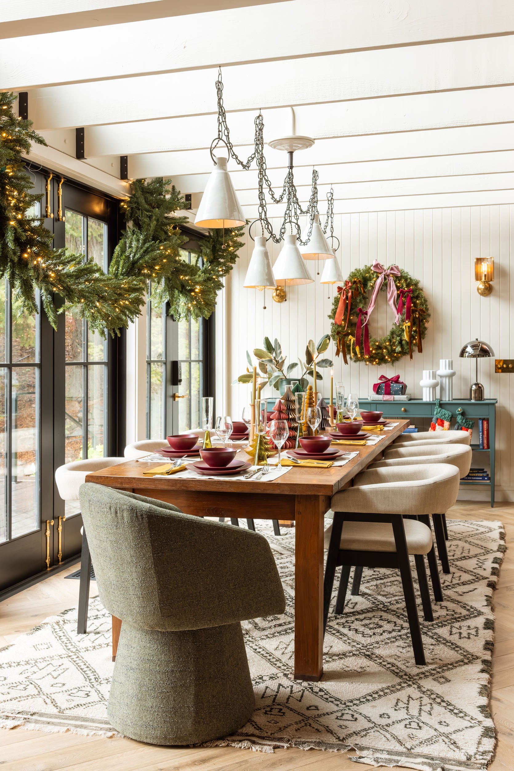 Ready for my personal holiday decorating schedule? (Remember that my job alters a typical process, so NO PRESSURE). Ok, October: start gathering inspiration, new ideas, and any new pieces you want (good stuff can sell out). November: it’s dark/wet outside, so it’s fun to start adding greenery and twinkle lights (yes, faux for us inside, real outside comes later, and no, we don’t host Thanksgiving – we travel to family that week). And then the Saturday after Thanksgiving, we have our small family ornament hanging party (literally my favorite night of the year), and it’s an explosion of holiday from there on out. No holding back. No shame. Just utter joy. I really want people to do whatever schedule they want, real or faux, long or short. To me, this spreads out the fun (and the labor) and we get two months of twinkling lights, which help the darker nights and mornings so much (the magic doesn’t get old). For this shoot, we took to The Carly, the most magical rentable retreat estate outside of Portland, because we wanted to try out some fun new holiday decor ideas using pieces from AllModern. They have so many great holiday gems, and The Carly is too special not to get a proper holiday makeover. If you are ready to decorate or not, check out these really pretty areas that my team and I created, and hopefully, it will give you some ideas and inspiration going. It sure did for me 🙂