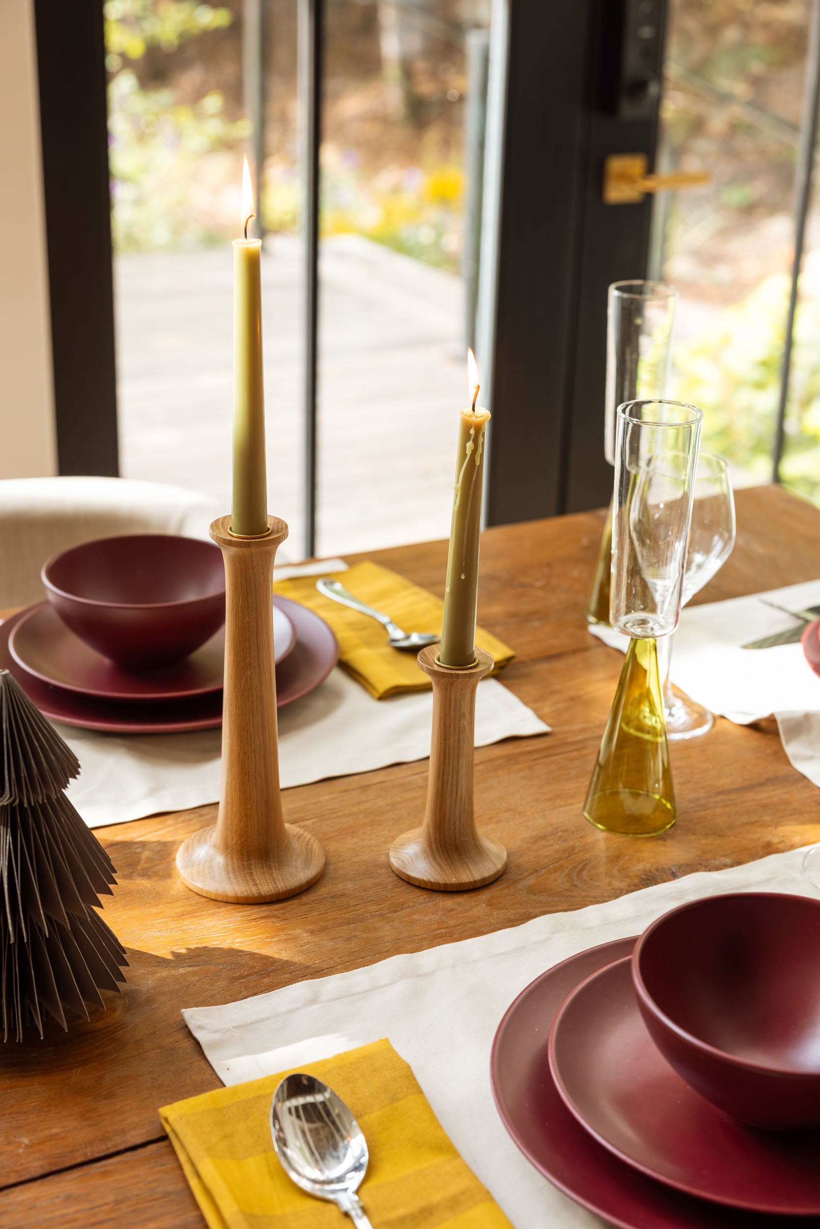 Taper Candles | Wooden Candlestick Holders | Green Glass Flutes