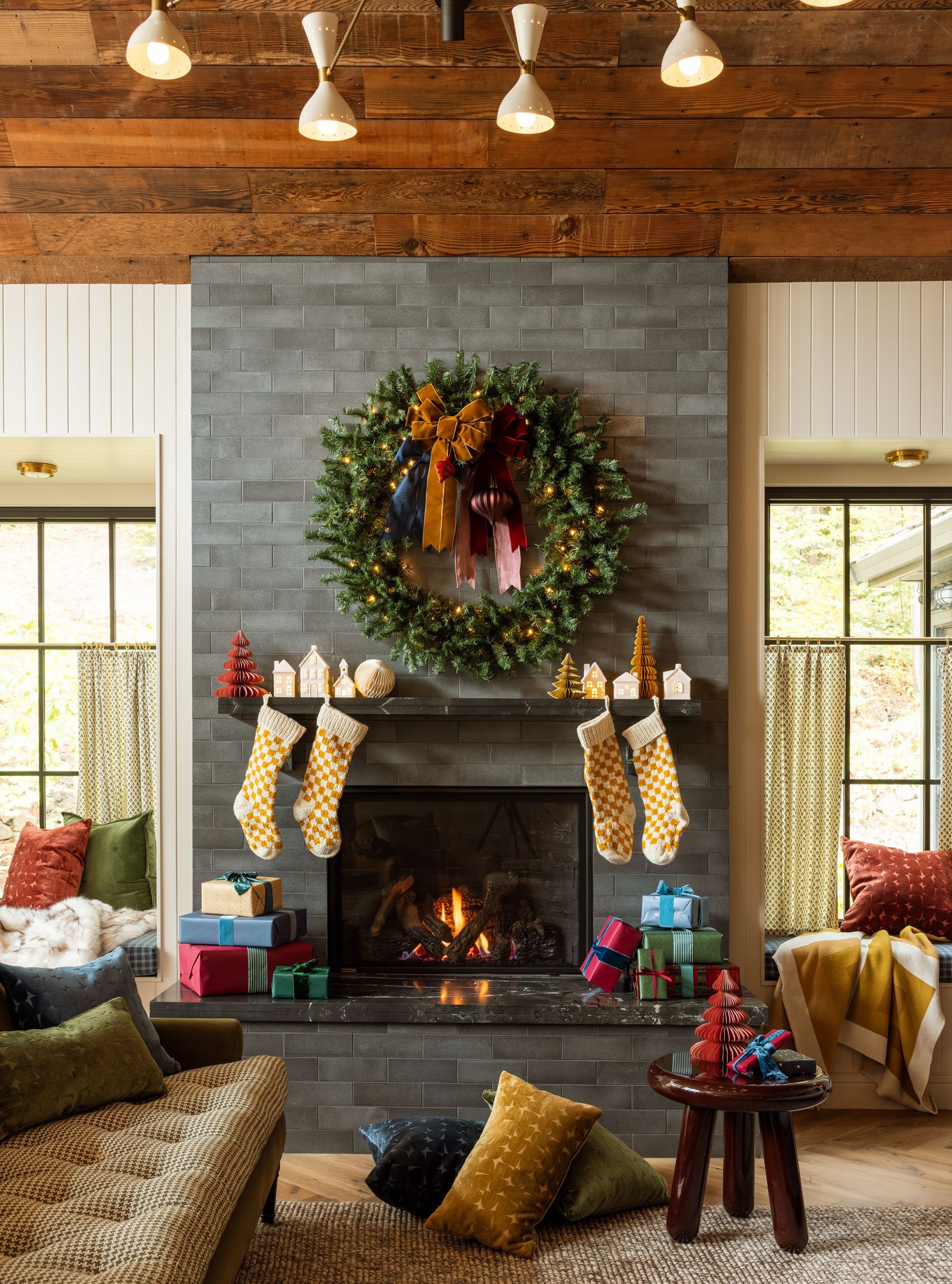 All the cut velvet pillows are so soft, high quality in the prettiest jewel tones, and clearly we like mixing them all together (and are great year-round). And that 4′ wreath is KILLER (so hard to find that big of a size) and will be living on our huge picture window outside (it’s not pre-lit, but easy to string). Fun fact, there was a big white outlet (for a future Frame TV) on the fireplace, so we hid it with that collection of bows (not AllModern) that frankly turned out so cute.
