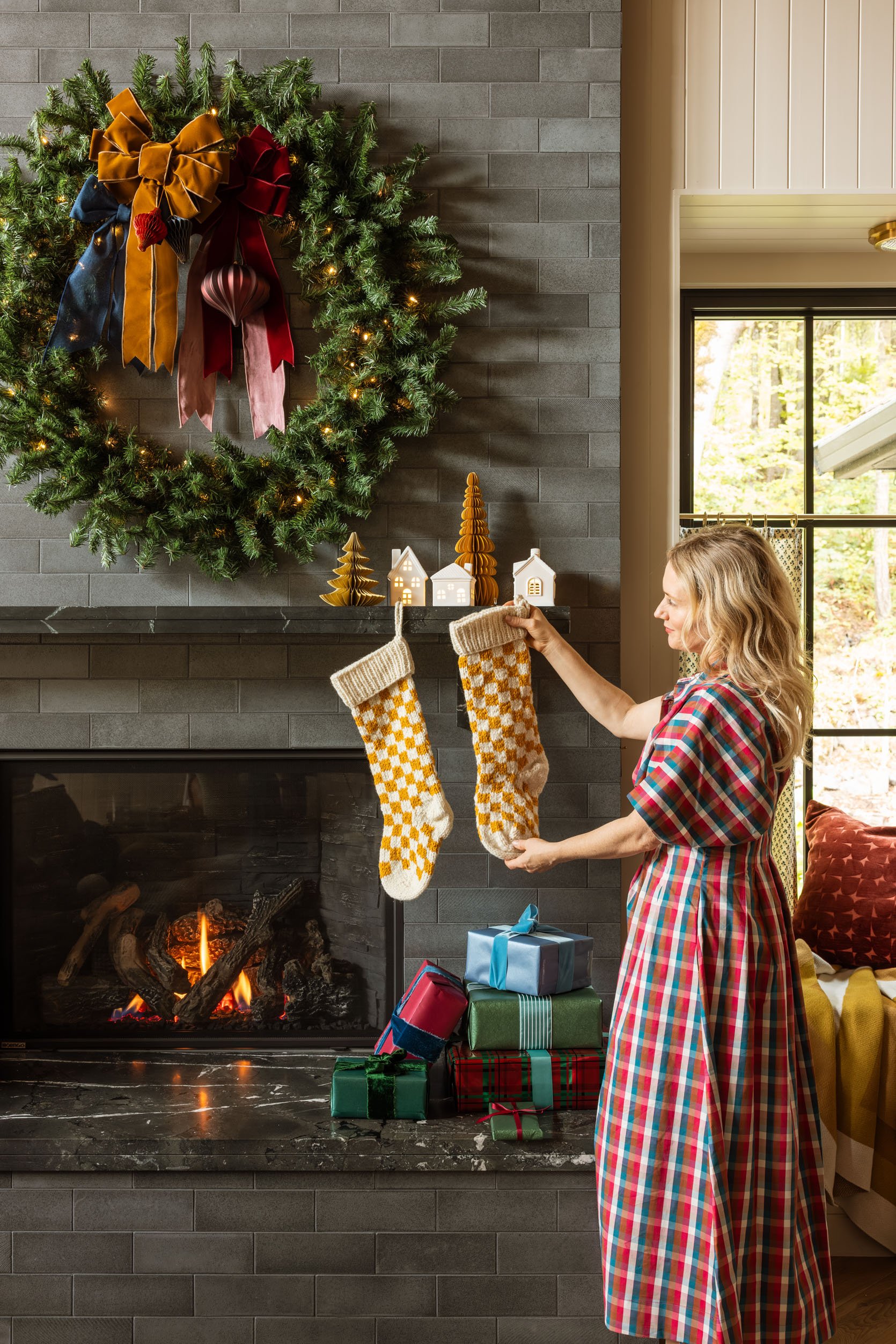 The stockings are ochre and cream check, in a chunky knitted wool. This colorway works so well with our jewel-toned palette (it’s really just a gold, so in a way it acts as a neutral). I love our stockings, but boy am I tempted to use these this year because they are so pretty and well-made (and dare I say “on trend”). They come in green/cream and red/cream as well, should you want a more traditional color.