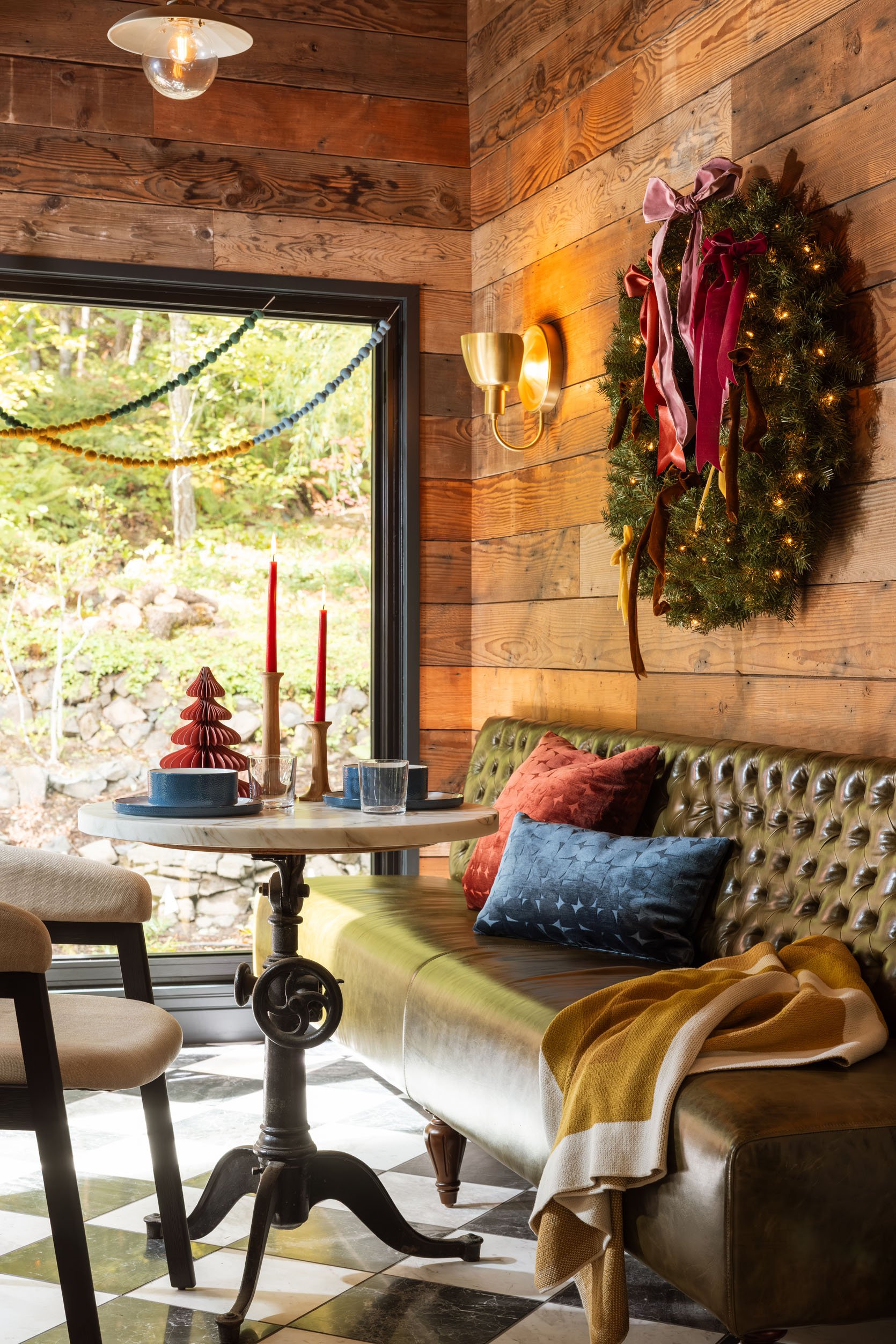 Pre-Lit Wreath | Gold Throw Blanket | “Gumdrop” Velvet Pillows | Felt Garland