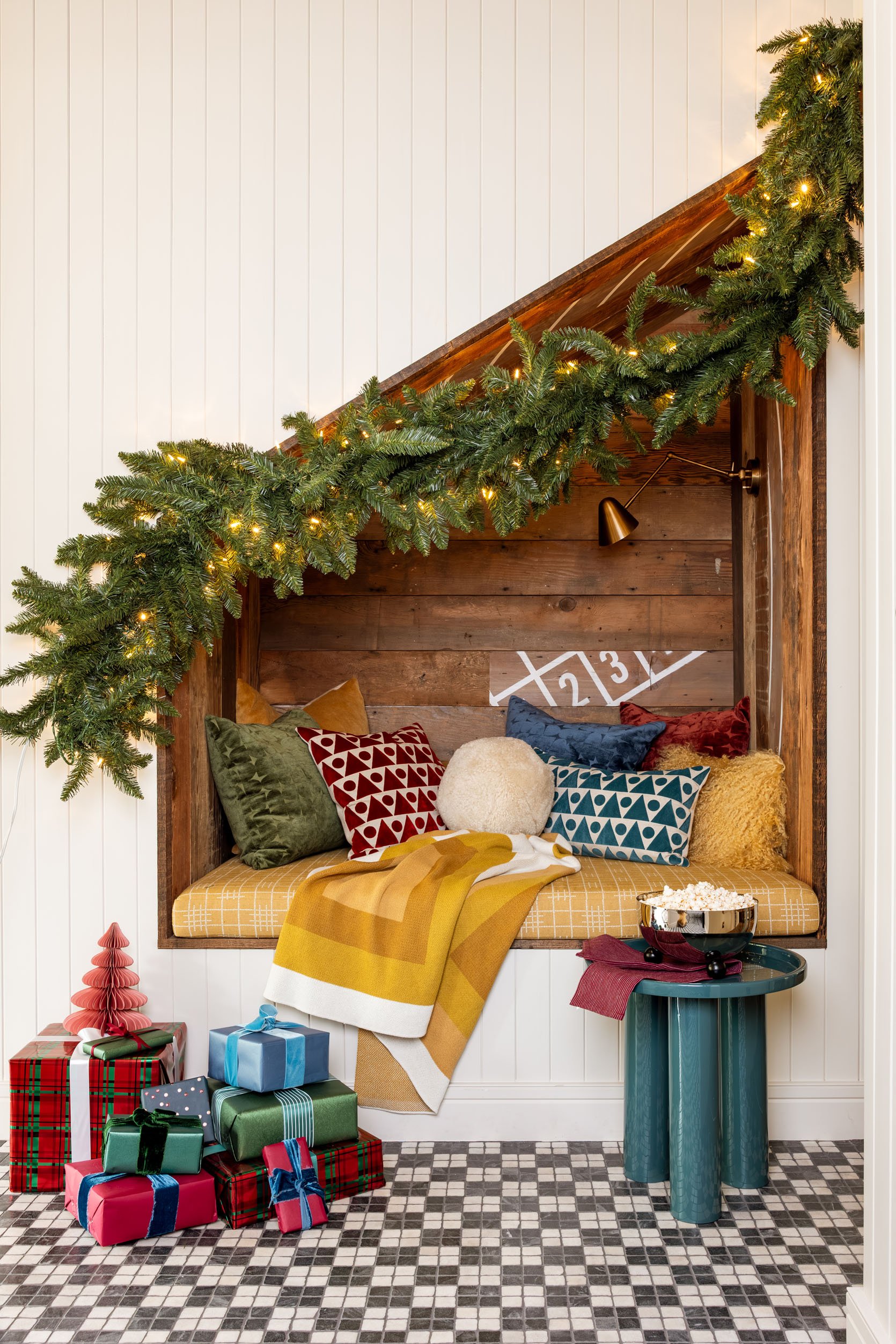 We couldn’t not shoot this nook – it’s so sweet and cozy. We used one of the garlands to frame it out and layered it with a ton of pillows from AllModern, accented with the modern lacquer table.