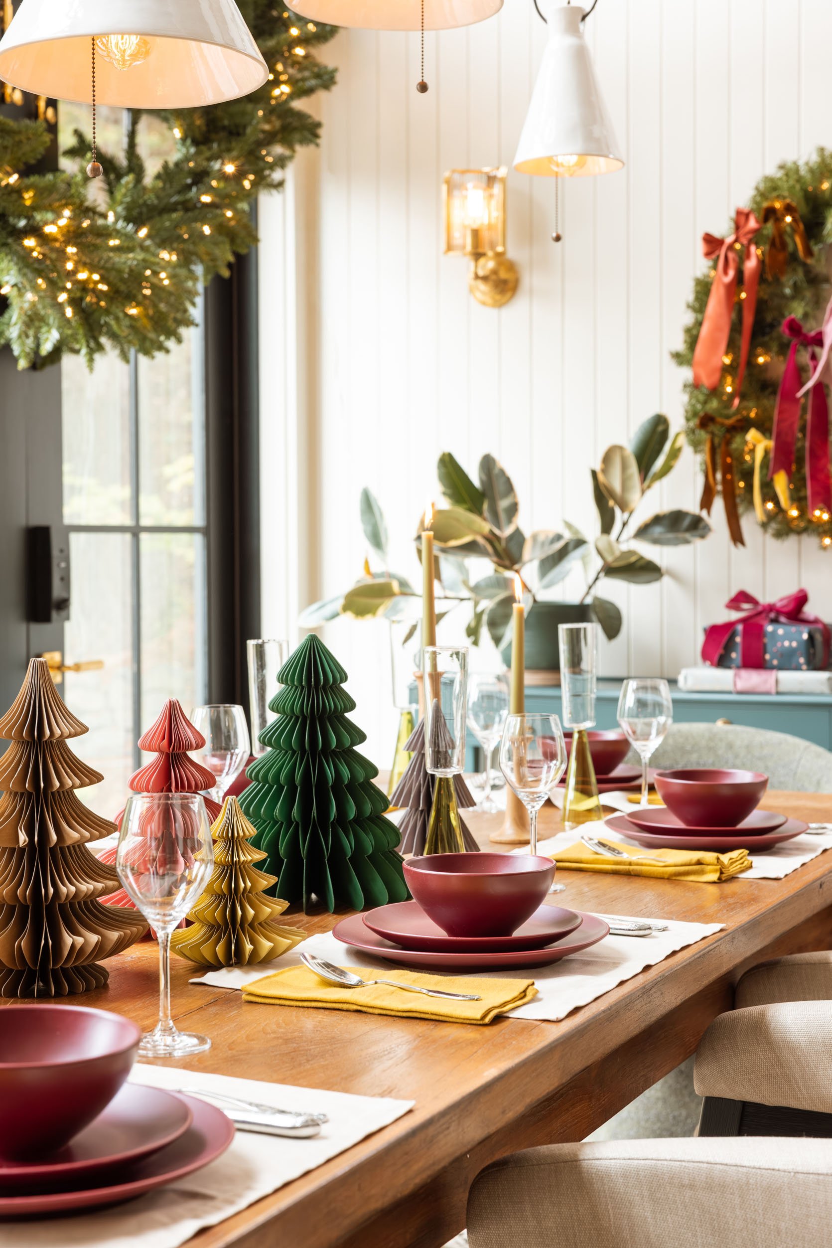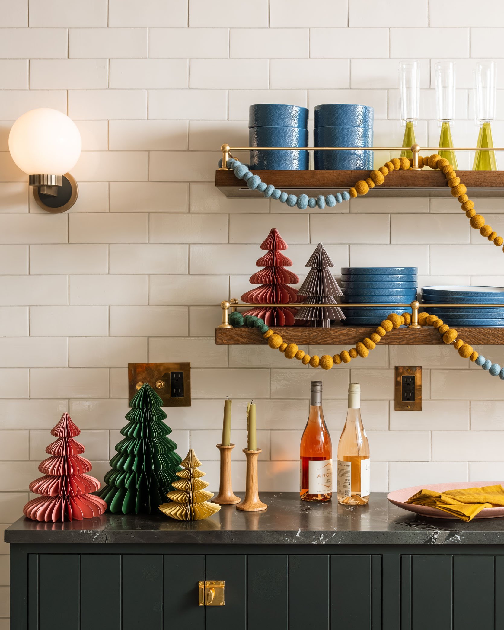 I want to call out how pretty the texture of the trees is – the light just plays so well with all the paper folds. Here we styled out the shelves with some felt garlands (great for trees, too) and these new stackable blue plates, which pop so well.