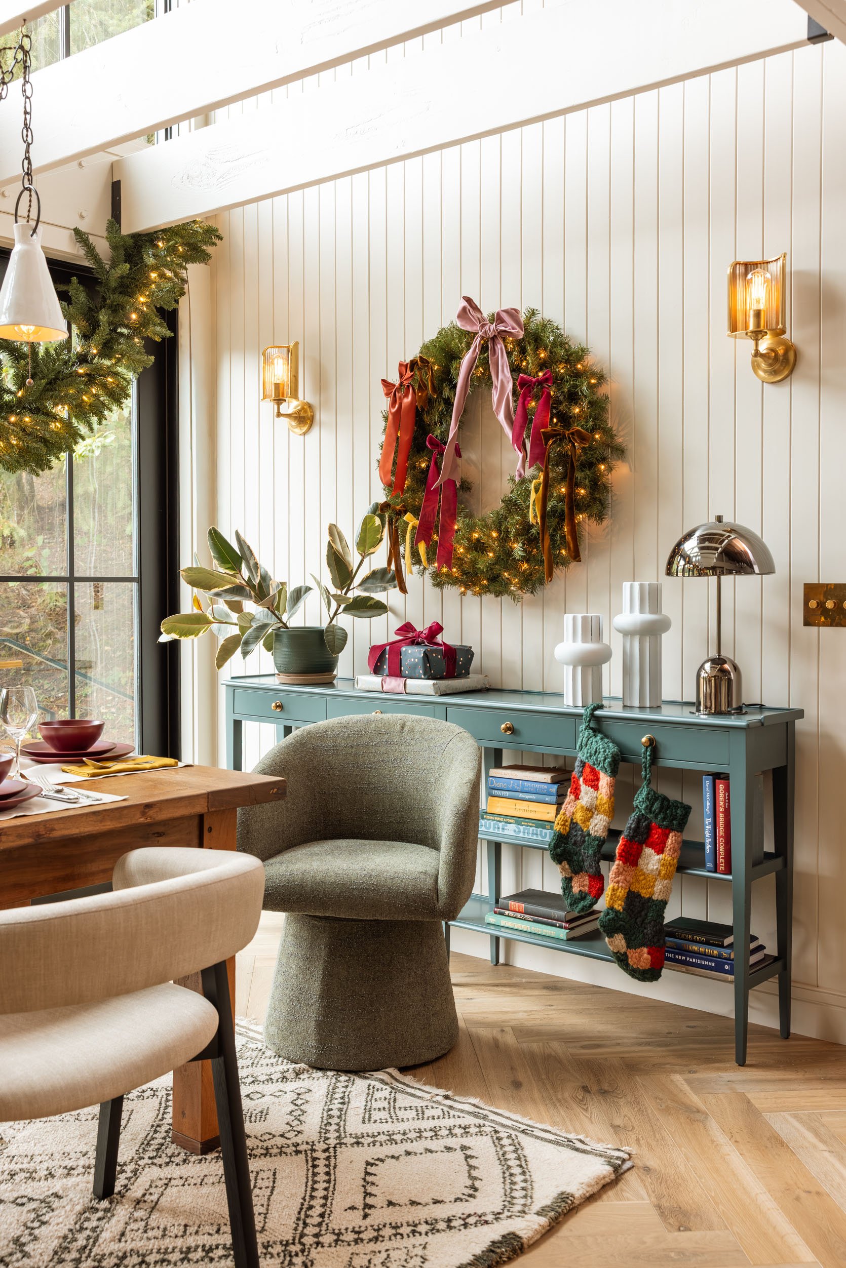 Pre-Lit Wreath | Pair of Vases | Colorful Stockings | Chrome Lamp