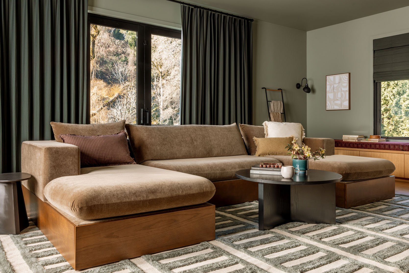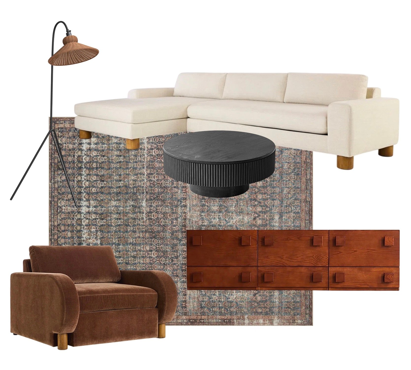 Ok, we’re done with only greens and neutrals, and bringing in some blues and a much warmer wood! That sectional (Milo) is wonderful, and you can have the chaise on either side (it also comes in a single sofa). Its perfectly chunky feet give it that space under but also work so well with the chunky coffee table, accent chair, and media console. But then, to make sure there’s a little extra lightweight piece, that lamp is so pretty, and the rug has so much movement and color. You’ve likely heard me talk about that chair and the sofa below because they are my children:) They were my first real design of this collection, and if I had space for them (or at least this chair) in my home, they would be here in a second. Oh, and that “media console” is actually three pieces next to each other (and are sold separately). Clearly, it’s modular, so you can stack as you please!